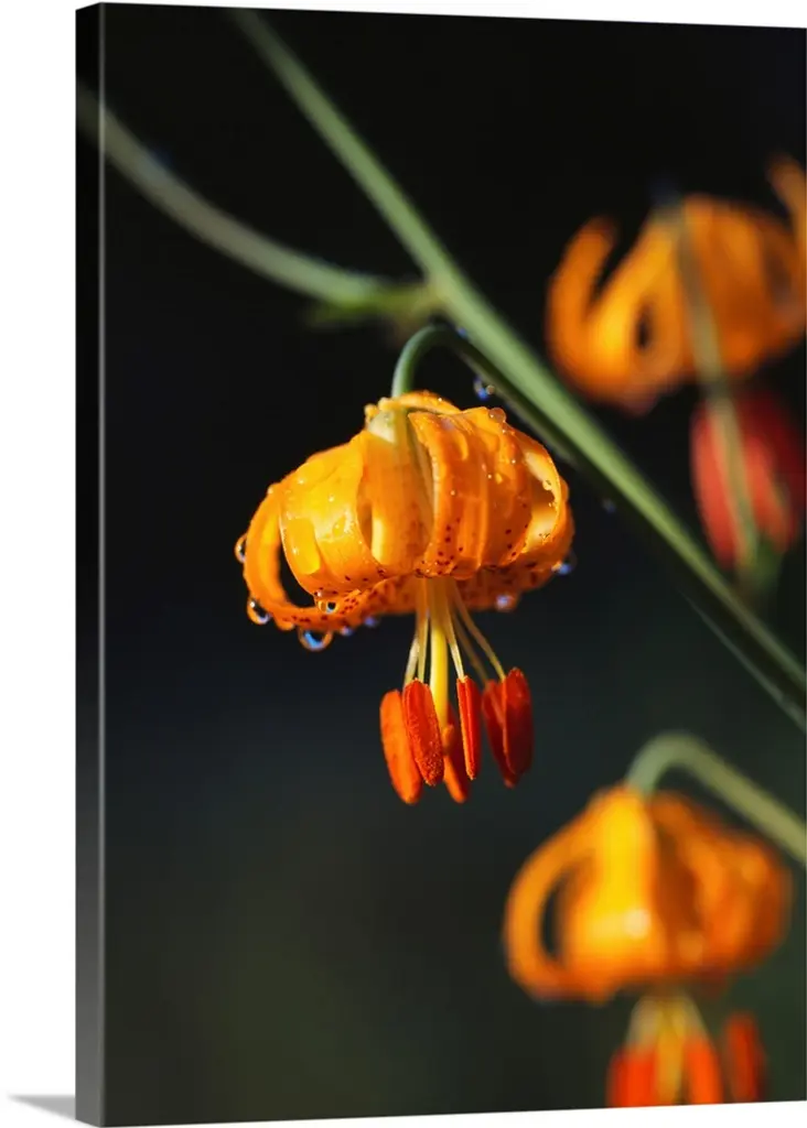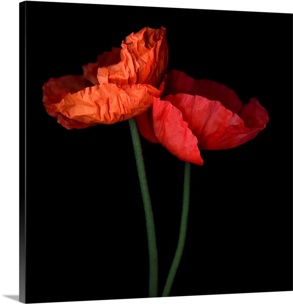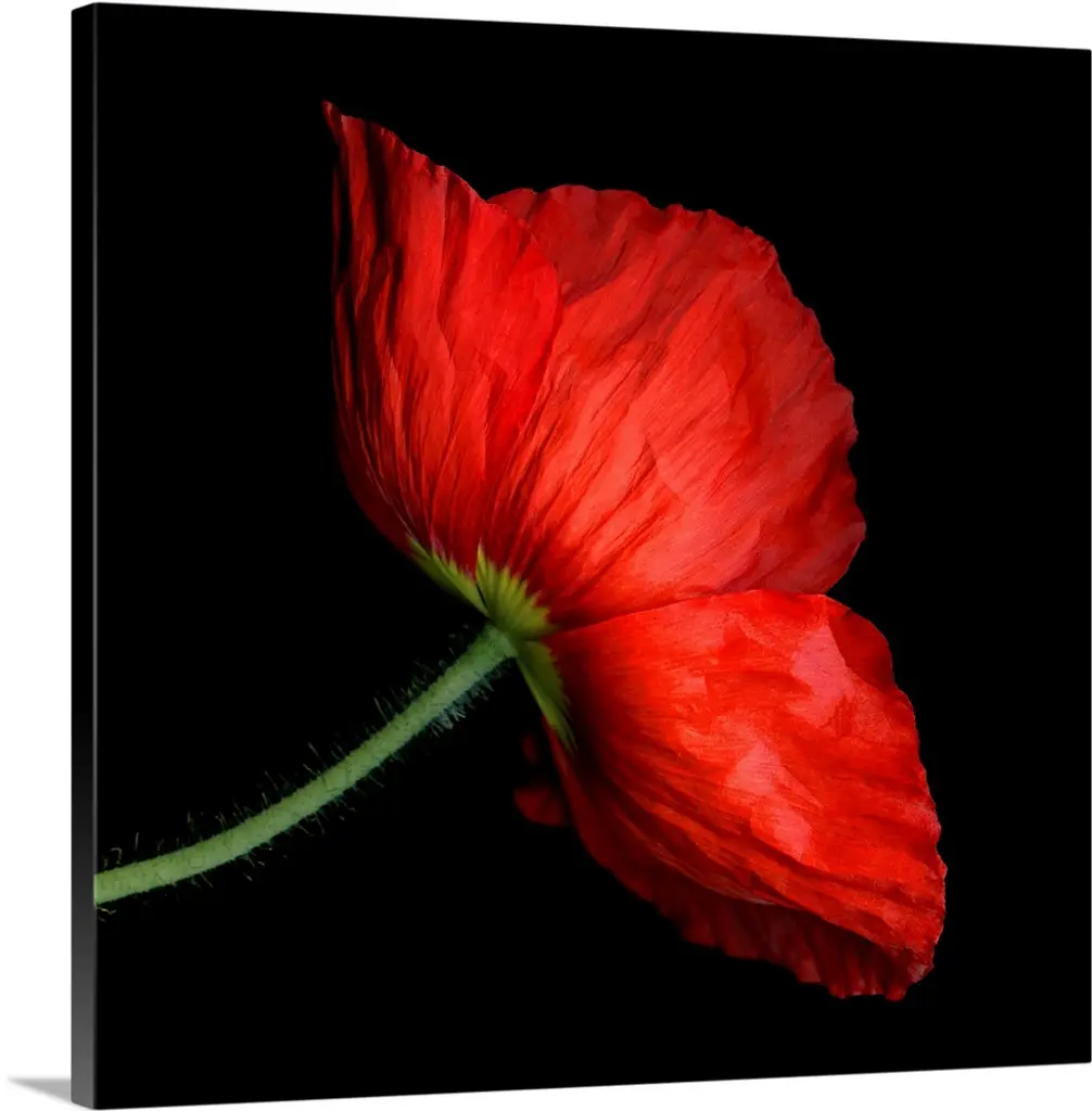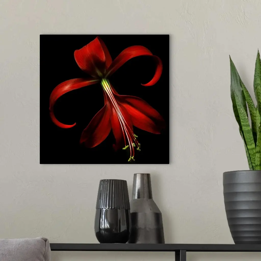 Huge, floral wall hanging of a large red lily on a solid black background.