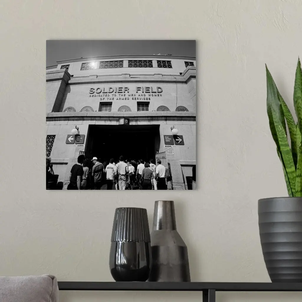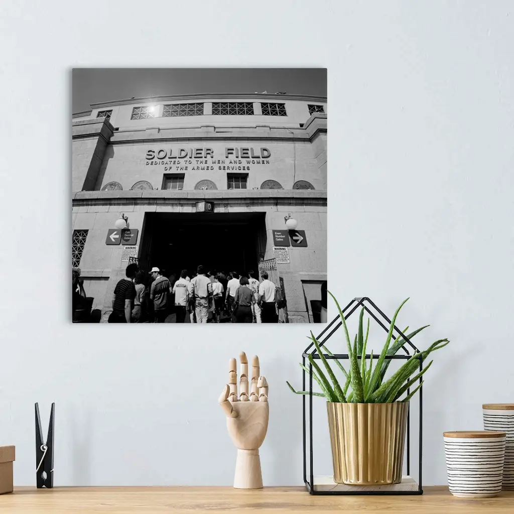 A black and white photograph of fans entering the Chicago Bears stadium with the fields name displayed just above them.