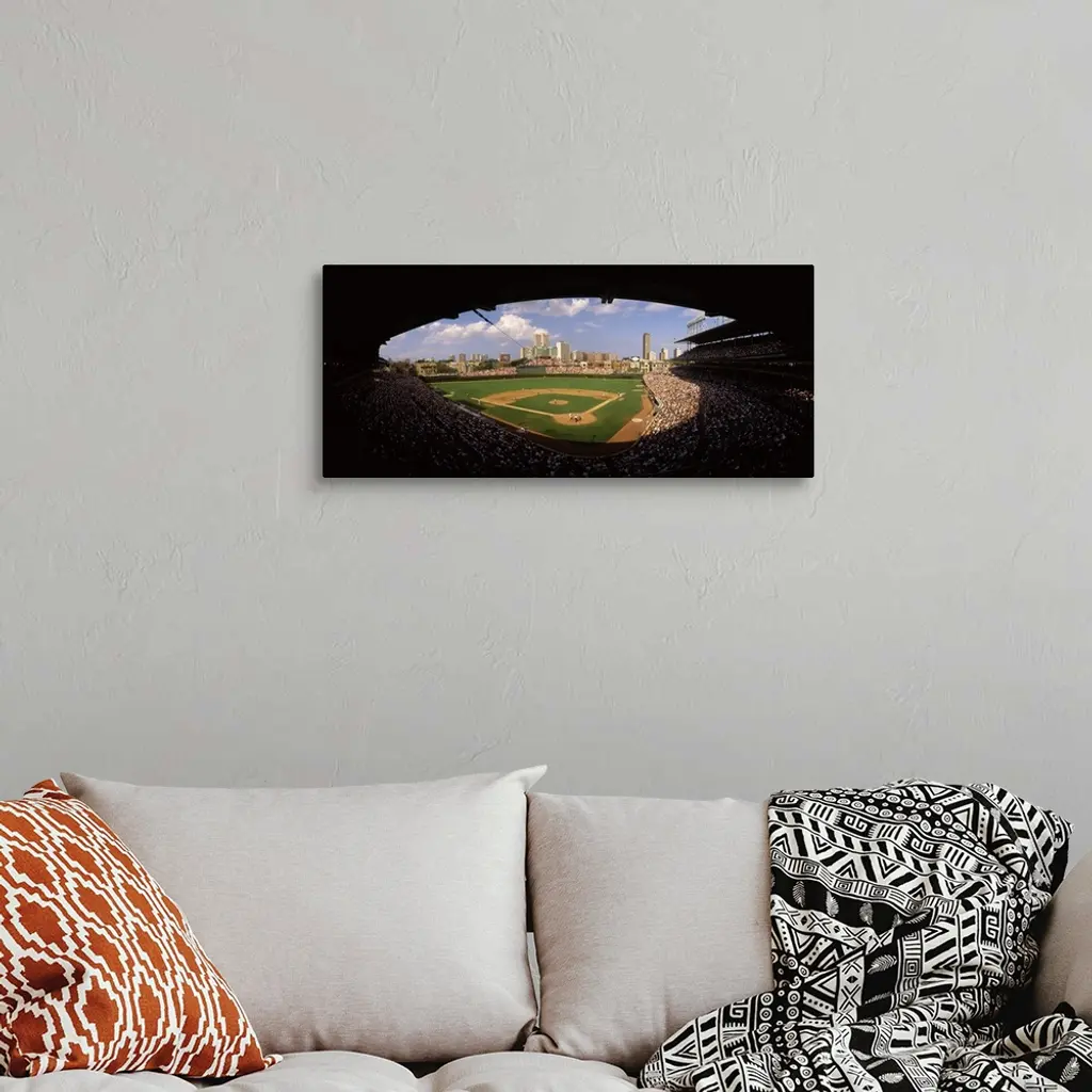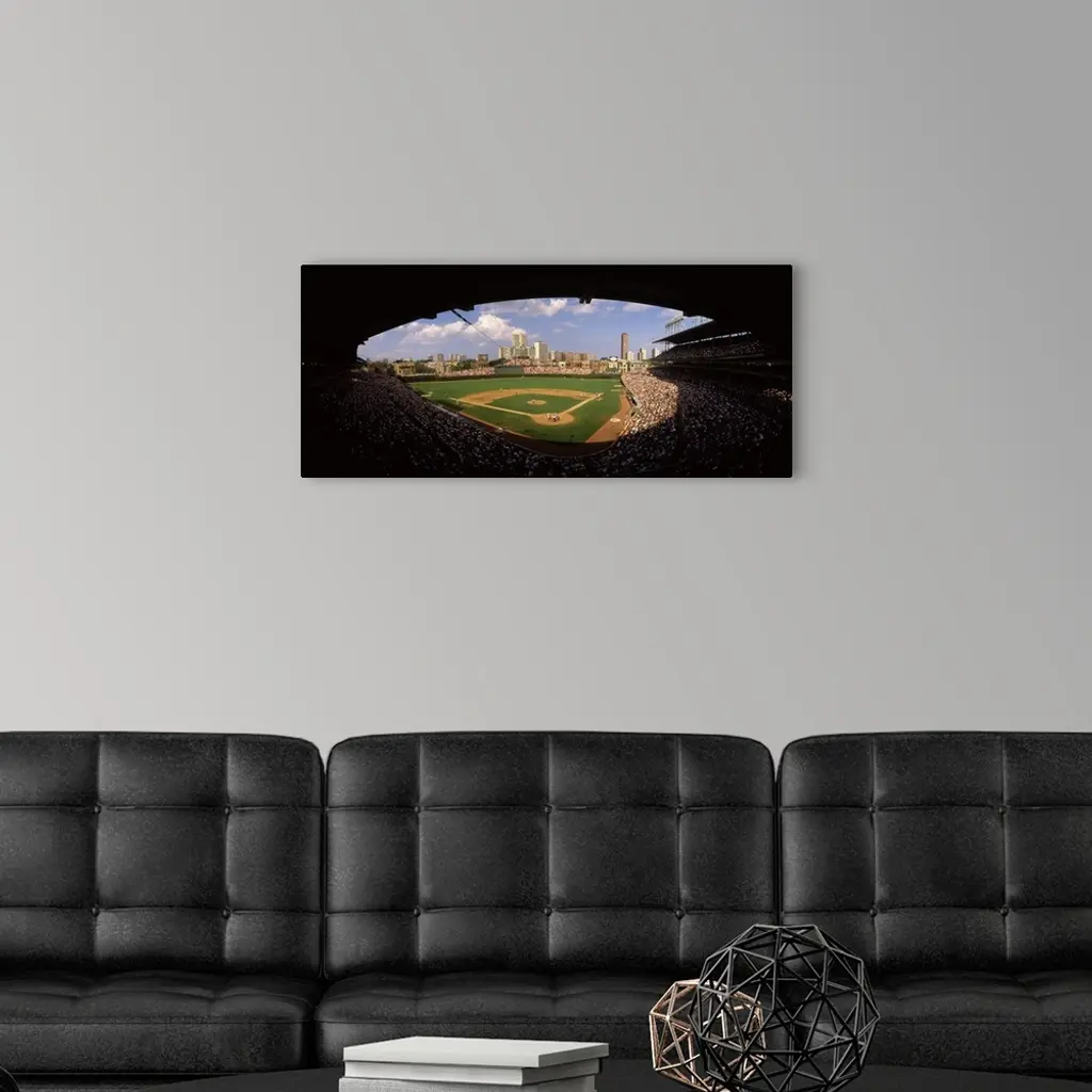 Panoramic photograph taken from a section way behind home plate shows the historic ballpark and stands for a National League Major League Baseball team within the Midwestern United States. Over the ivy covered walls in the outfield and bleachers behind them, the skyline of this busy city can be seen across the horizon.