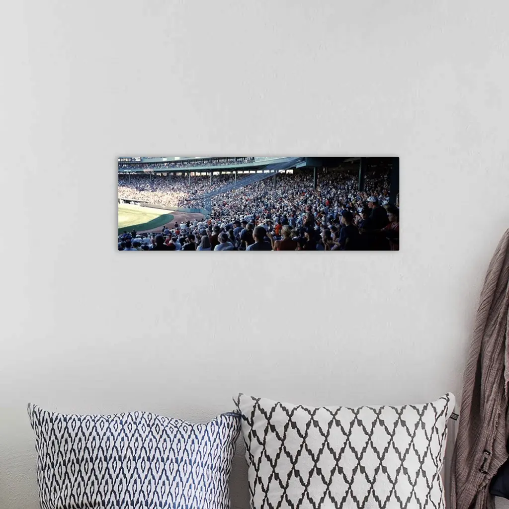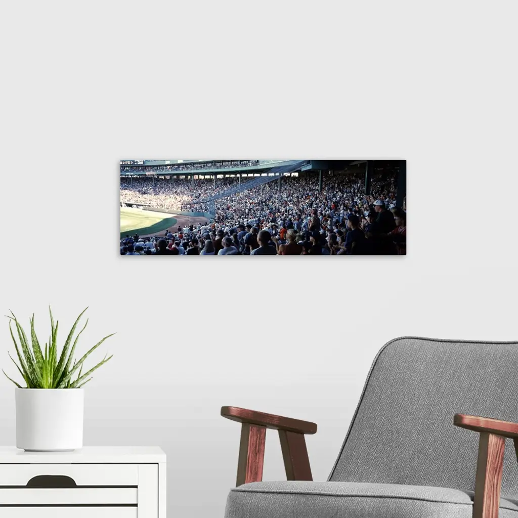 Panoramic, big photograph of packed stands of fans watching a baseball game at Fenway Park, in Boston, Massachusetts.
