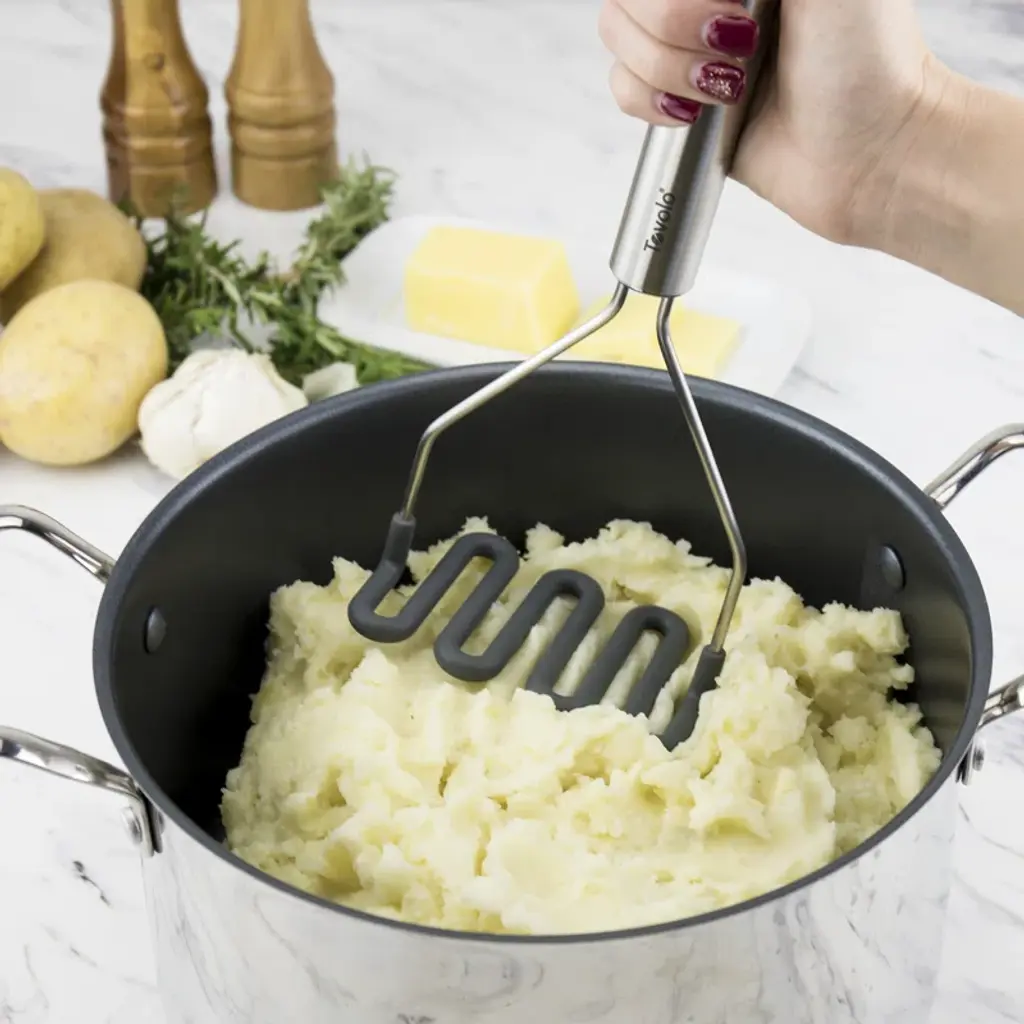 Make perfect cream cheese mashed potatoes to combine with your dish with Ybm Home potato master possess the power of mashing this potato masher is a streamlined single-piece staple with comfort grip handle, smooth edges, and a seamless design to squash steamed or boiled potatoes and vegetables. The perforated small holes force vegetables through the holes. The art of smooth, creamy potatoes without lumps is you need to be methodical with your mashing method, getting into every corner of the bowl and using a twist motion. Premium utensil made with food grade, this potato masher is built for precise functionality and performance in mashing, pressing, and squashing veggies to perfection. It is firm, solid, and durable to last for many years to come. Never worry about denting, cracking, or rusting this amazing kitchen utensil.