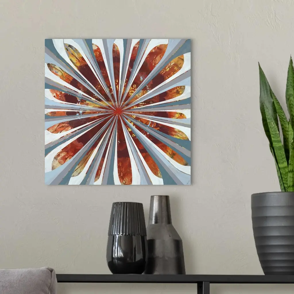 Contemporary art pf a large floral shape outlined in cool tones that overlaps a warm cluster of fiery and golden fall colors.