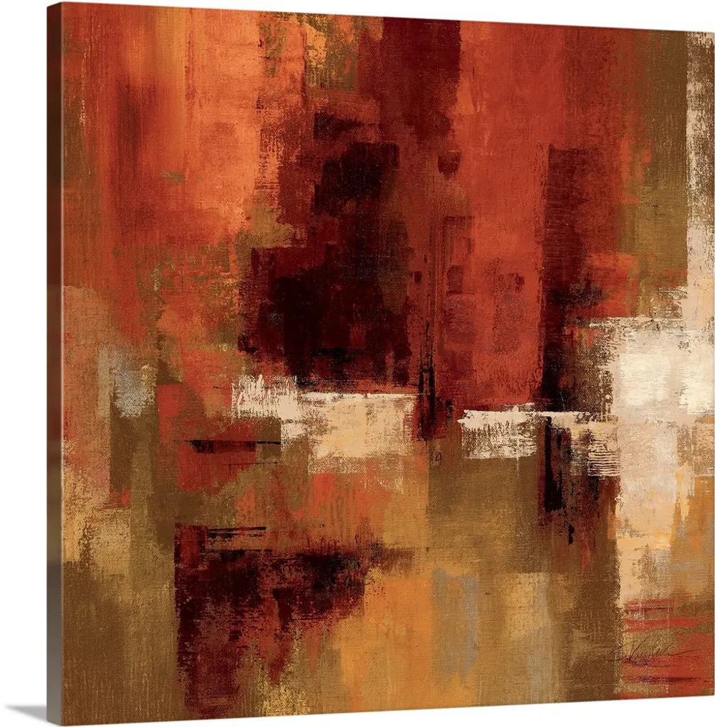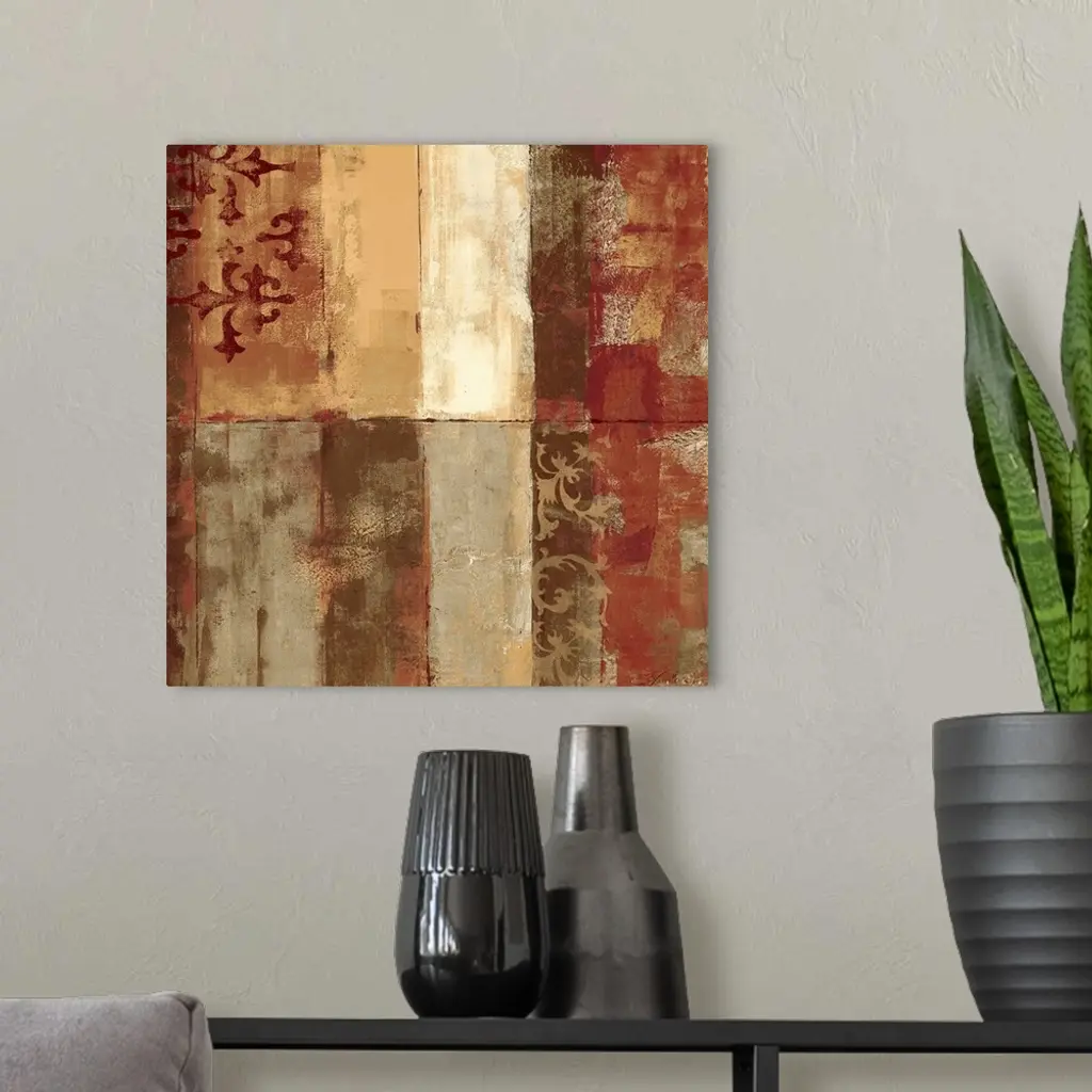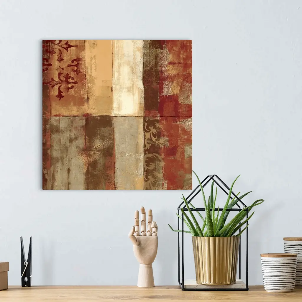 Big abstract art composed of distressed vertical rectangles of the same size stacked on top and next to each other. The earth toned rectangles have a few small sections covered by intricate designs.