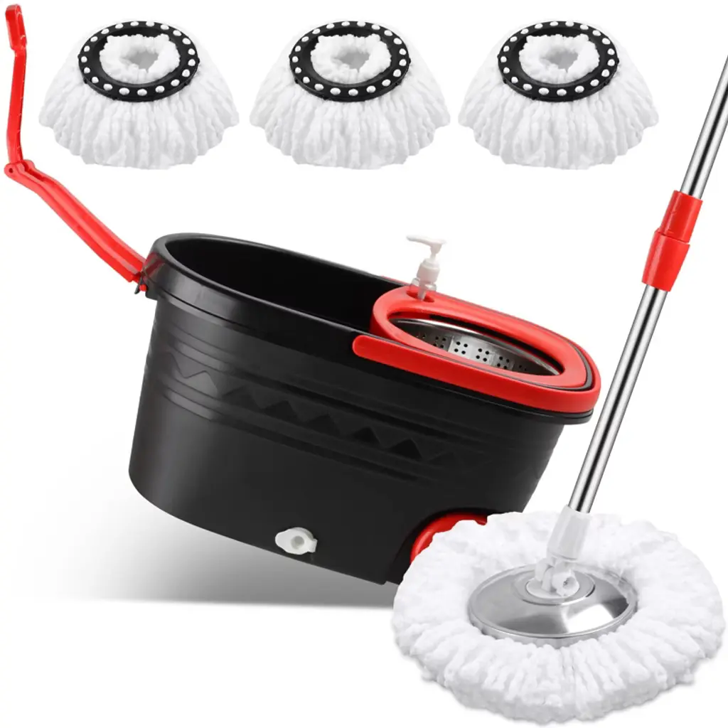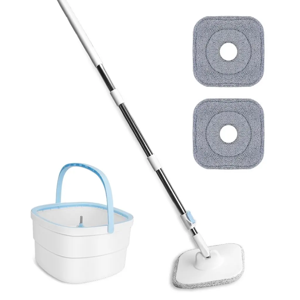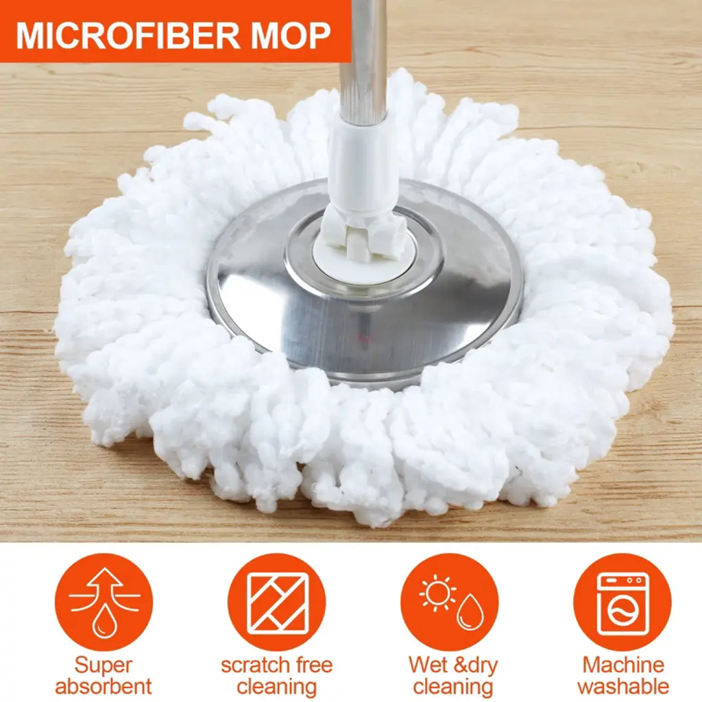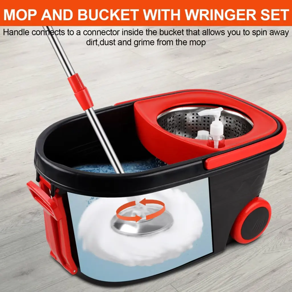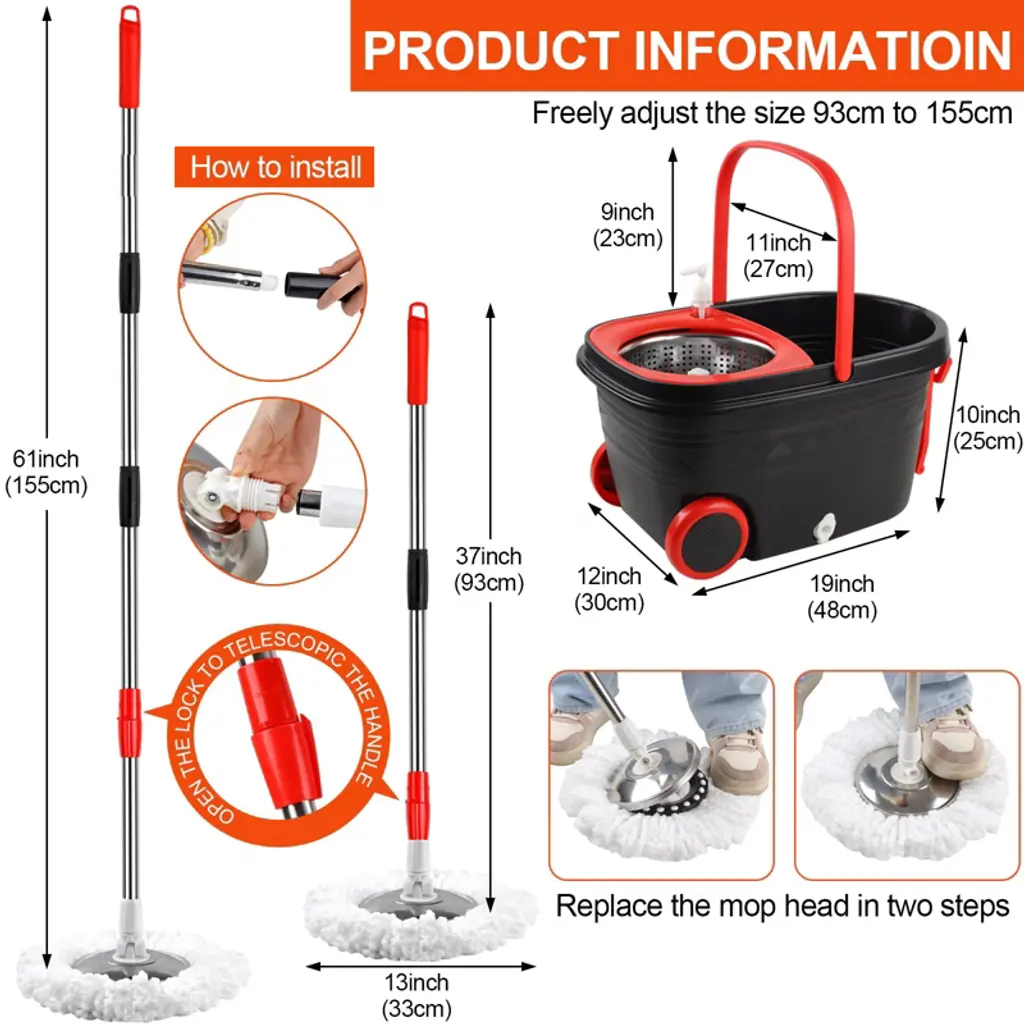 【Fast Drying】 Stainless steel drying drum dries mop heads easily. Utilizes centrifugal force to dry mop attachments quickly and efficiently. The spinning mop and bucket system includes an agitator that rotates to shake out dirty water to keep your hands clean and dry.【Easy Adjustment】Updated stainless steel retractable handle extends up to 61 feet, the retractable handle and pull bar makes it easy for anyone to mop without bending over. The new large mop bucket with two wheels is very flexible and sturdy, suitable for moving the mop bucket easily during large-scale cleaning.