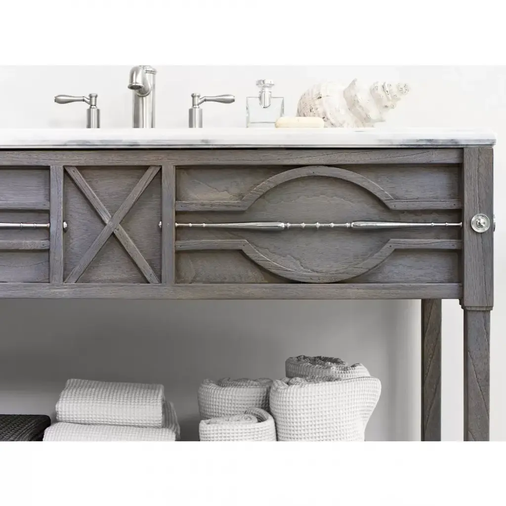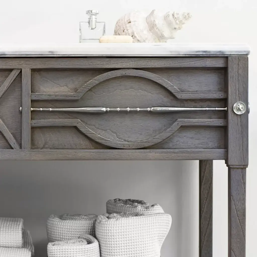 Made of Mindi wood solids and veneers with a beautiful weathered grey finish accented with solid brass, nickel finish spindles and medallions. Top is white Bianco Giulia marble with an oval undermount polished nickel sink. Use with non-overflow style drain system.