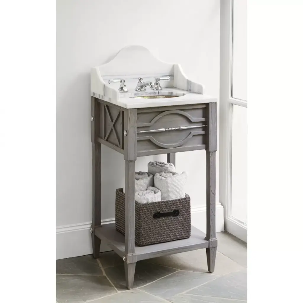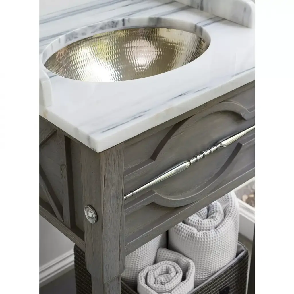 Made of mindi wood solids and veneer finished in weathered grey accented with solid brass nickel plated spindles. Top and decorative splash are Bianco Giulia marble. Hammered nickel undermount sink. Use with non-overflow style drain system.