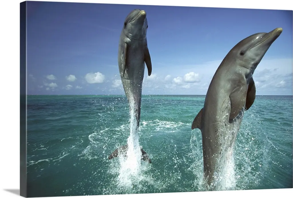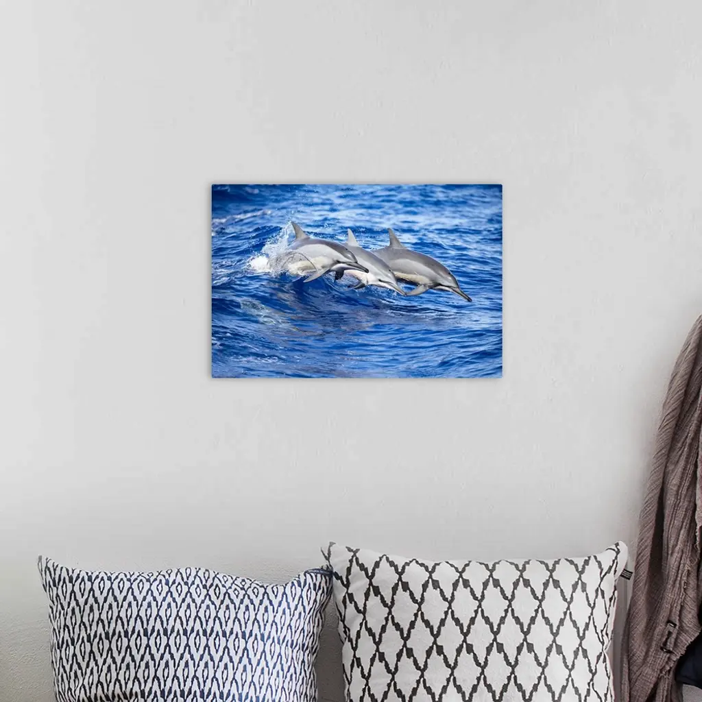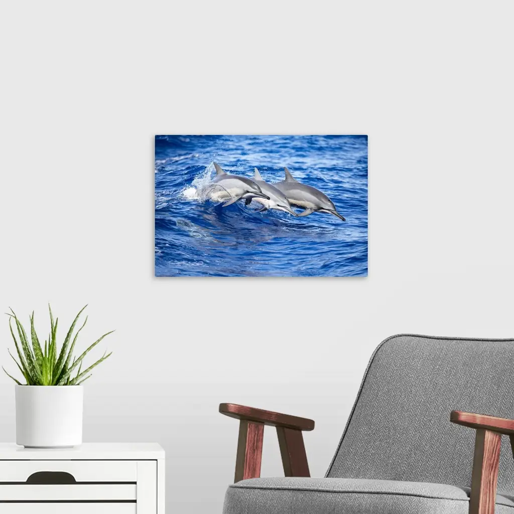 Three spinner dolphins (Stenella longirostris) leap out of the Pacific Ocean off the island of Lanai; Lanai, Hawaii, United States of America