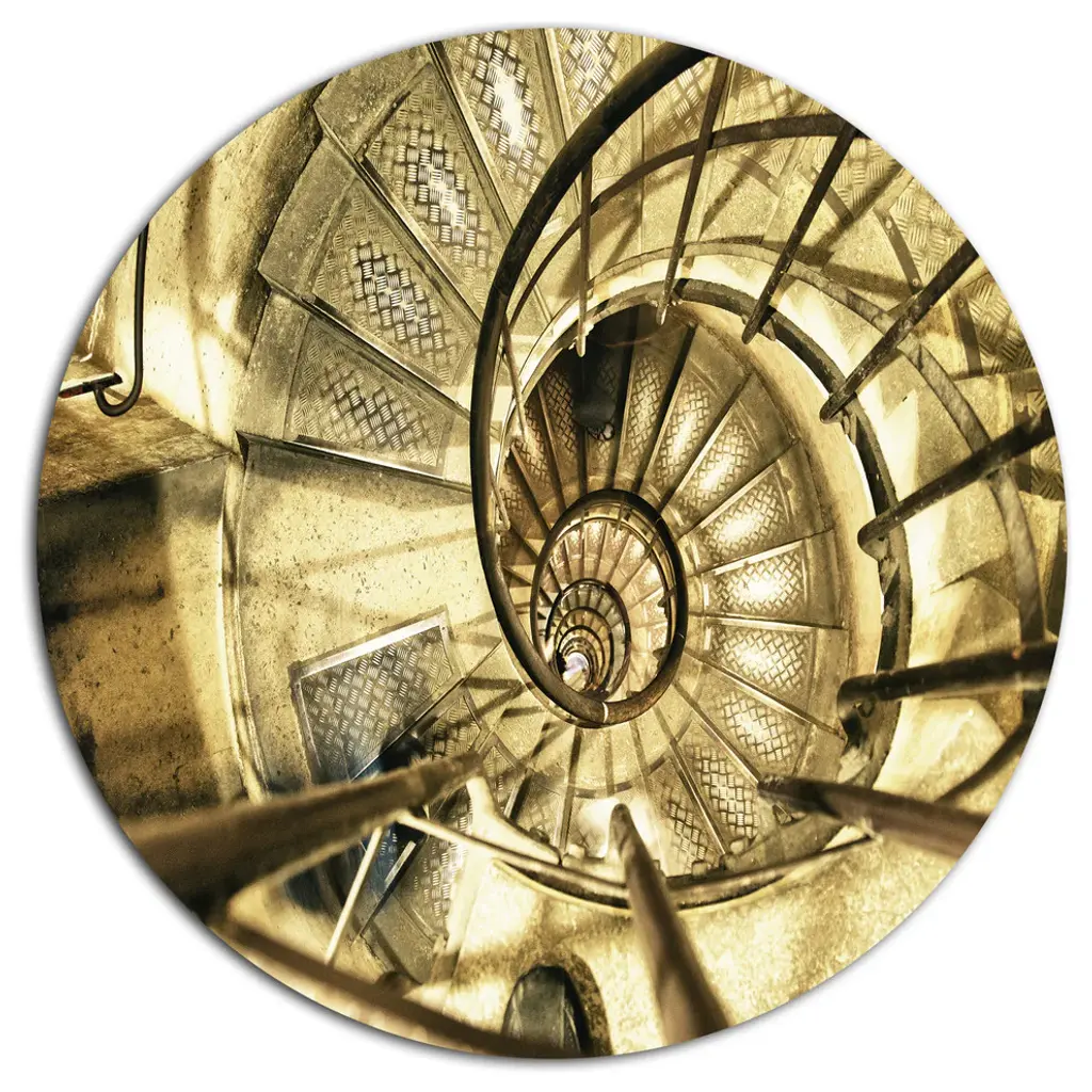 View through the center of a spiral staircase with red steps and white railings.