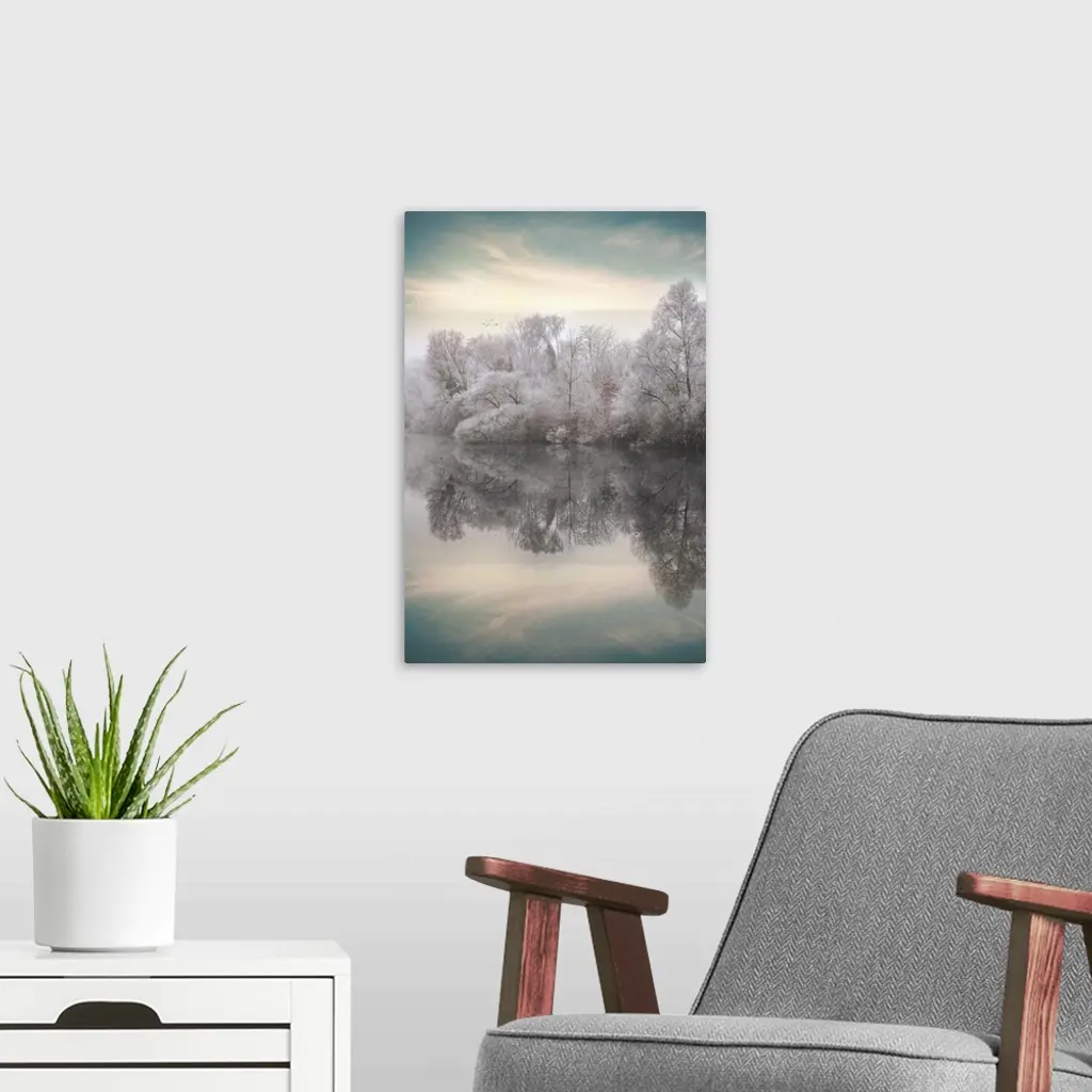 Reflecting photograph of snow covered trees and a blue sky onto a glass-like lake.