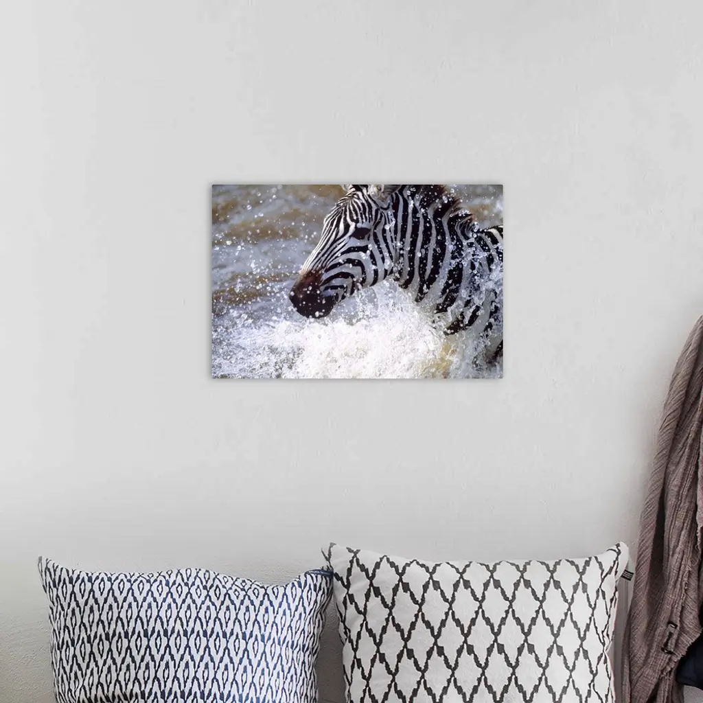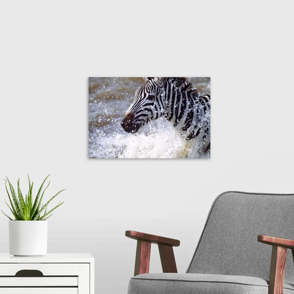 Photograph of a zebra running through a body of water as drops of water shoot upward.