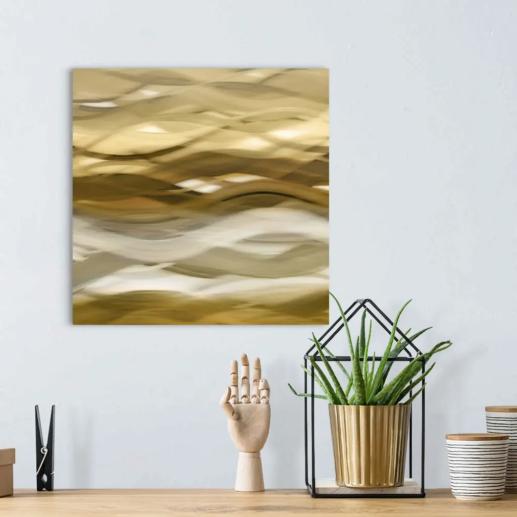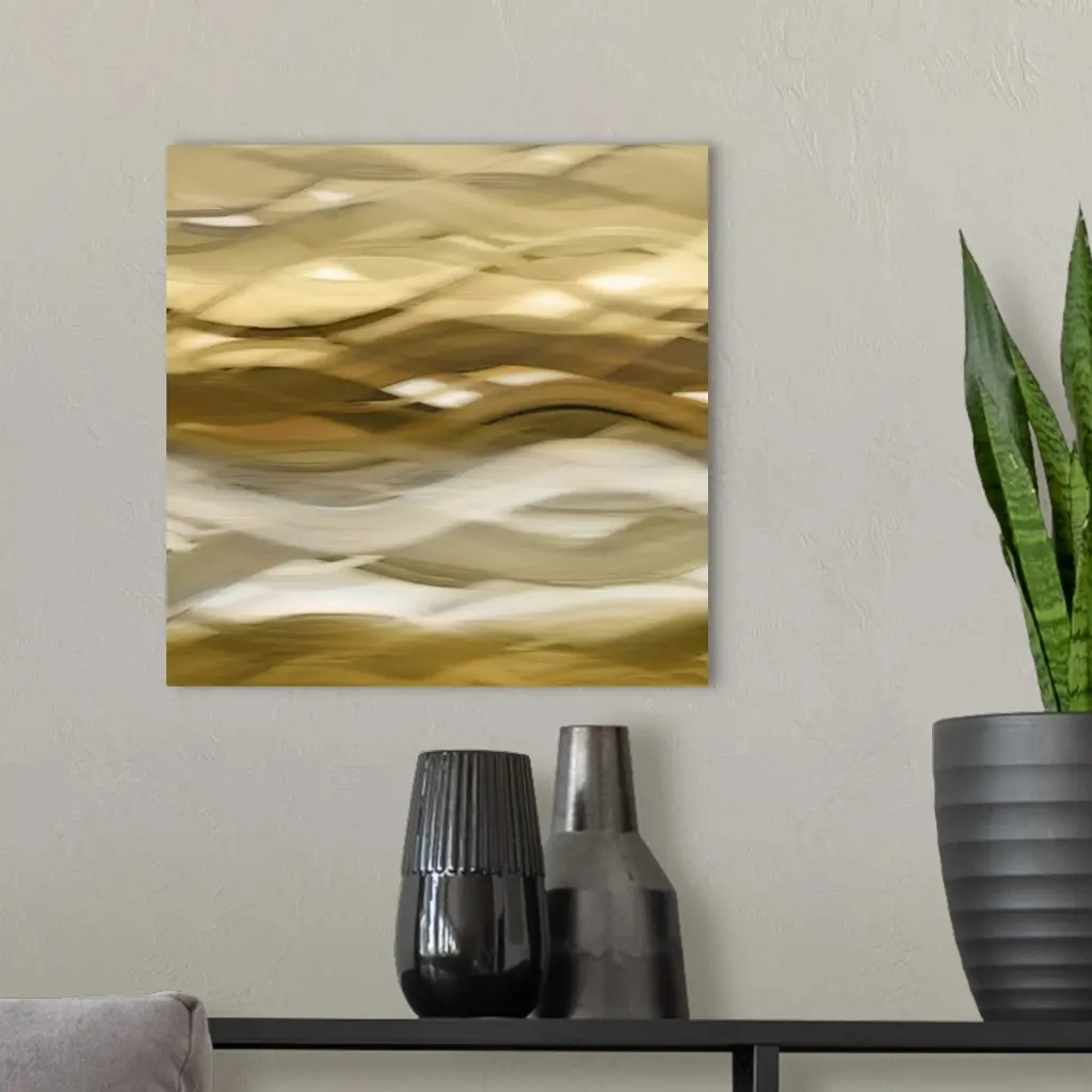 Square abstract art with blurred, wavy ribbons running horizontally along the canvas in shades of gold, white, and gray.