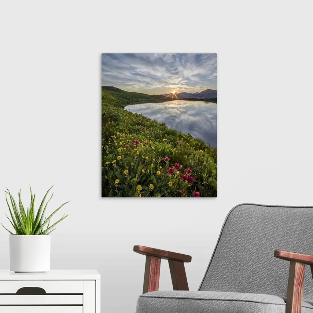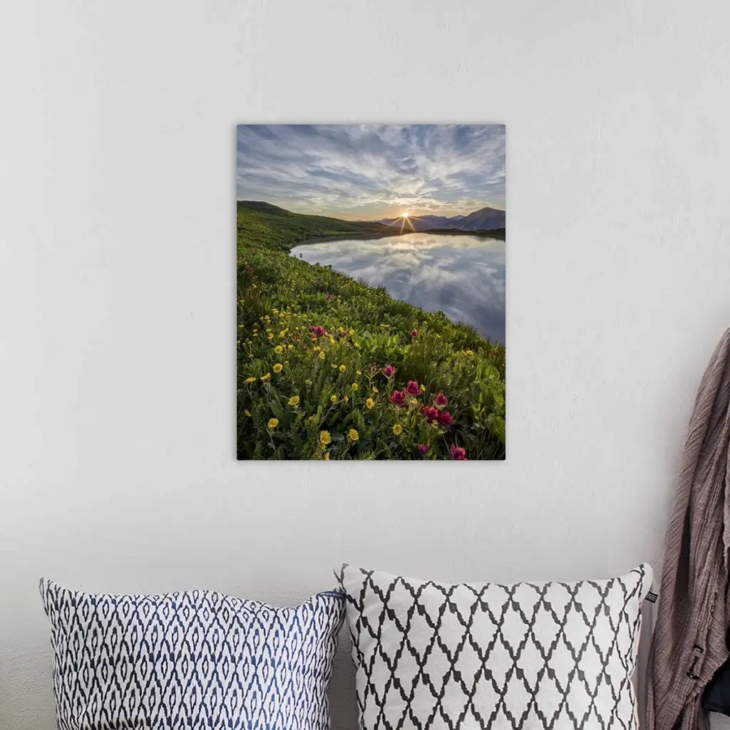 Sunrise behind rosy paintbrush (split-leaf Indian paintbrush) (spliteaf Indian paintbrush) (Castilleja rhexifolia) and Alpine avens (Ross's avens) (Acomastylis rossii turbinata), San Juan National Forest, Colorado, United States of America, North America