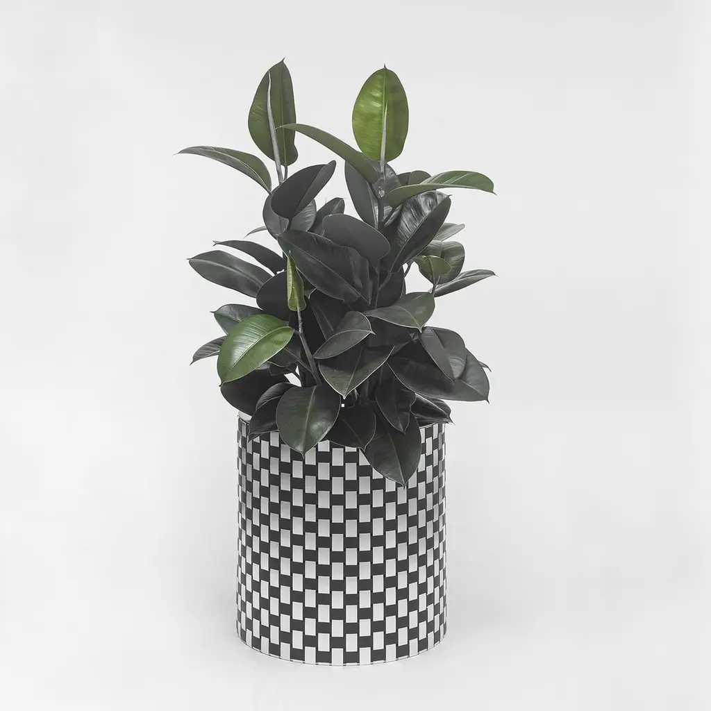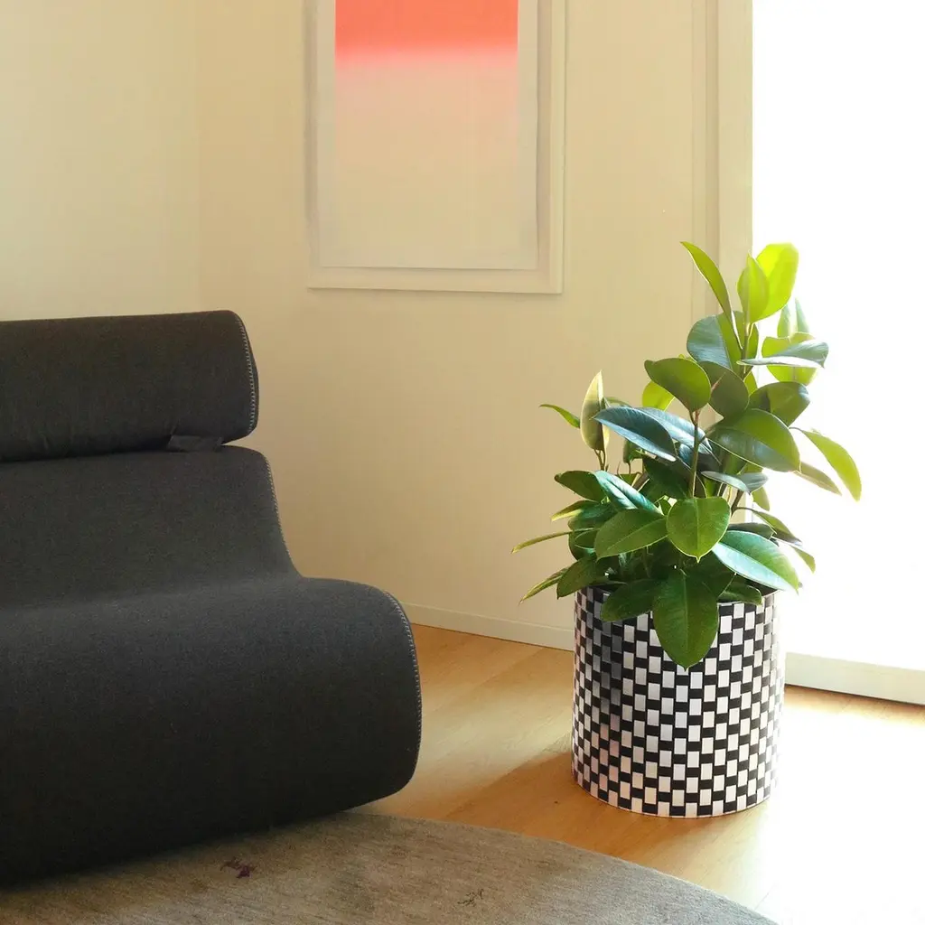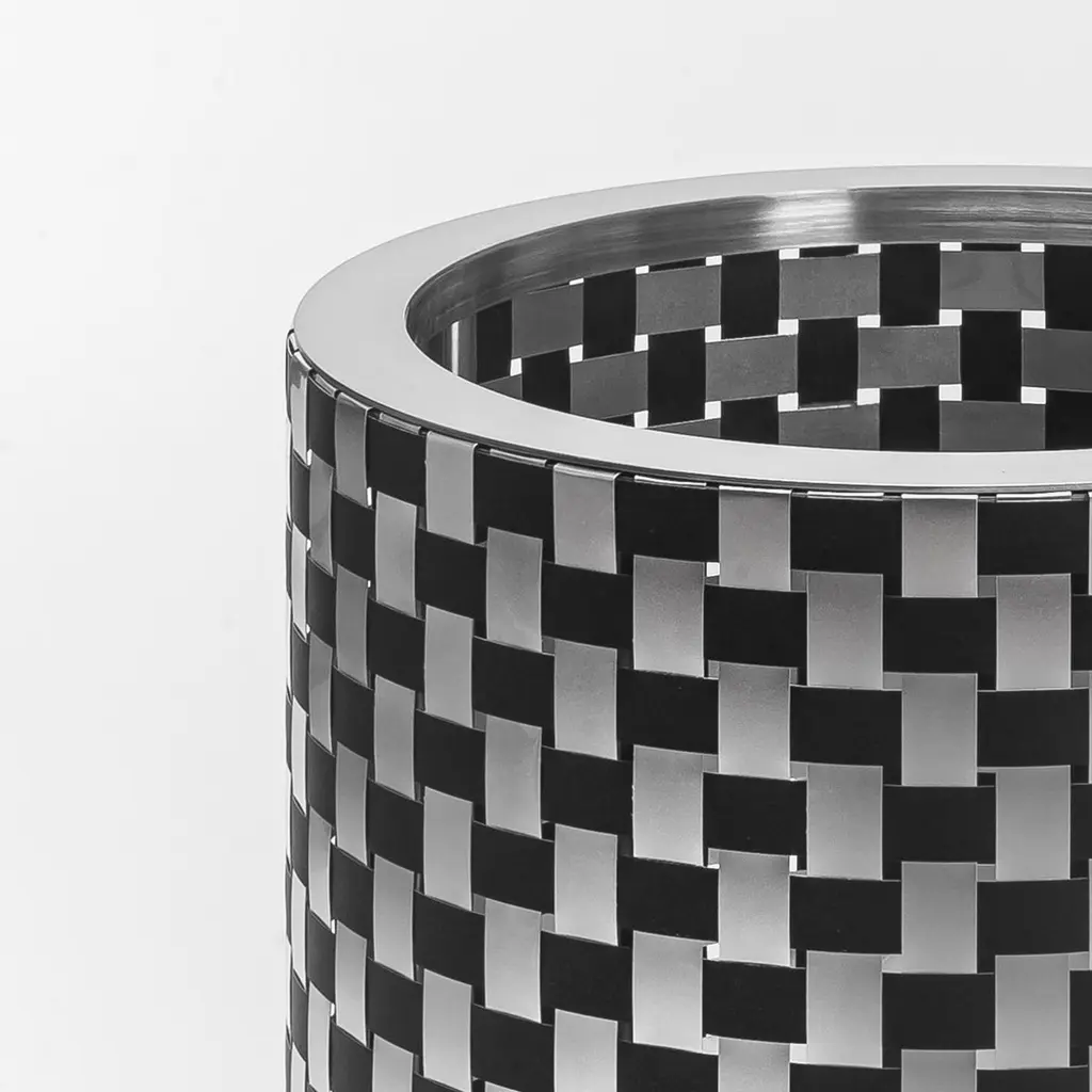 Inspired by the 1960s Optical Art style, this eye-catching cachepot gets its name from the handwoven, anodized aluminum material designed by Inthegarden Design Studio. Ideal for both indoor and outdoor use, this stylish optical effect and texture is created by the alternating interweaving of black and natural aluminum foils, that covers the steel-lined cylindrical shape.