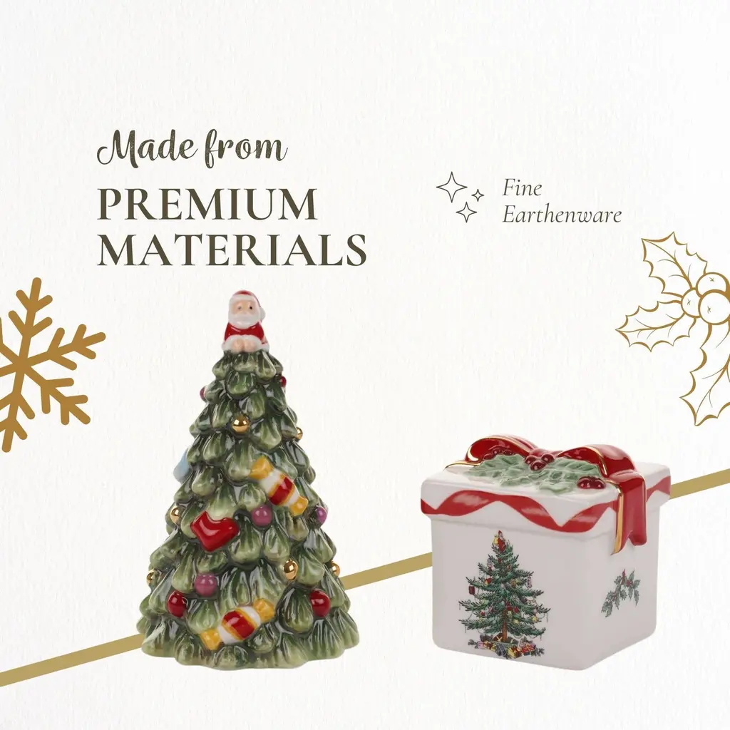 Spode Christmas Tree Tree and Gifta Salt and Pepper Shaker Set (2-Piece)- Holiday Kitchen & Table Décor - Festive Home Accent, Christmas Gift/Stocking Stuffer for Collectors & Holiday Enthusiasts - NewEnhance your holiday celebrations with the Spode Christmas Tree Tree and Gifta Salt and Pepper Shaker Set, a charming addition to your holiday kitchen décor. Part of the well-loved Christmas Tree collection, which has delighted generations since its introduction in 1938, this beautifully designed salt and pepper shaker set adds a nostalgic and festive touch to your holiday table. The collection has become a favorite among collectors and holiday enthusiasts, and continues to grow each season with new, exciting additions. This set is not only a delightful addition to your own home, but also makes a thoughtful gift. Presented in a Christmas Tree photo gift box, it’s an ideal present for anyone who loves to add festive touches to their table. Whether given as a gift, used as a stocking stuffer, or enjoyed as part of your holiday table setting, this set will surely bring smiles and conversation to any gathering. These salt and pepper shakers are designed to be both functional and decorative, bringing a touch of fun to your Christmas dinner. The classic Christmas Tree collection design evokes warm memories of holidays past, making them a charming piece to have on your holiday table. Their detailed and intricate design makes them a standout element in any holiday table décor. Made from durable dolomite ceramic, these shakers are designed for longevity and can withstand the busy holiday season. To maintain their beauty and festive appeal, they are best hand washed. Add a festive flair to your home with this delightful salt and pepper shaker set, the perfect addition to your holiday décor collection, and a must-have for any lover of Christmas-themed home accents.FEATURES:COLOR:MATERIAL:WHAT'S IN THE BOX:PACKAGING:Retail Packaging