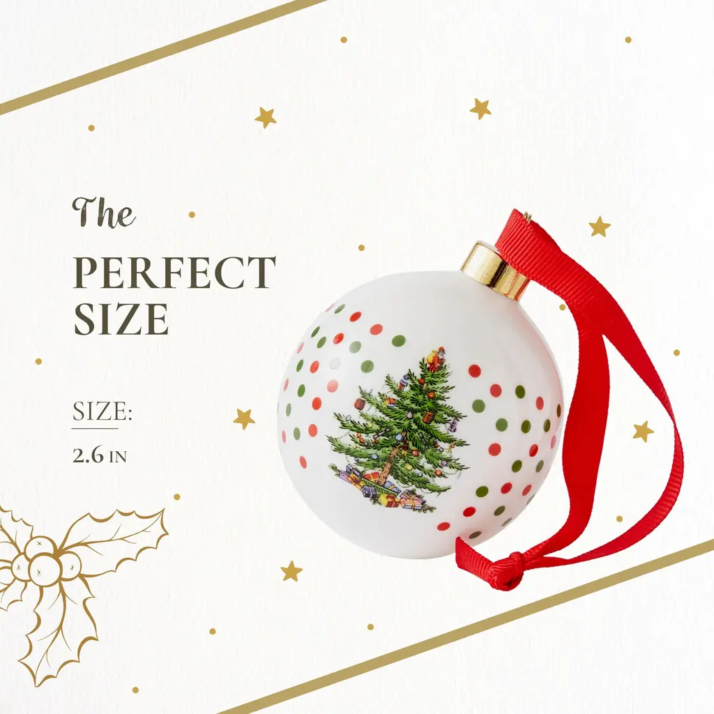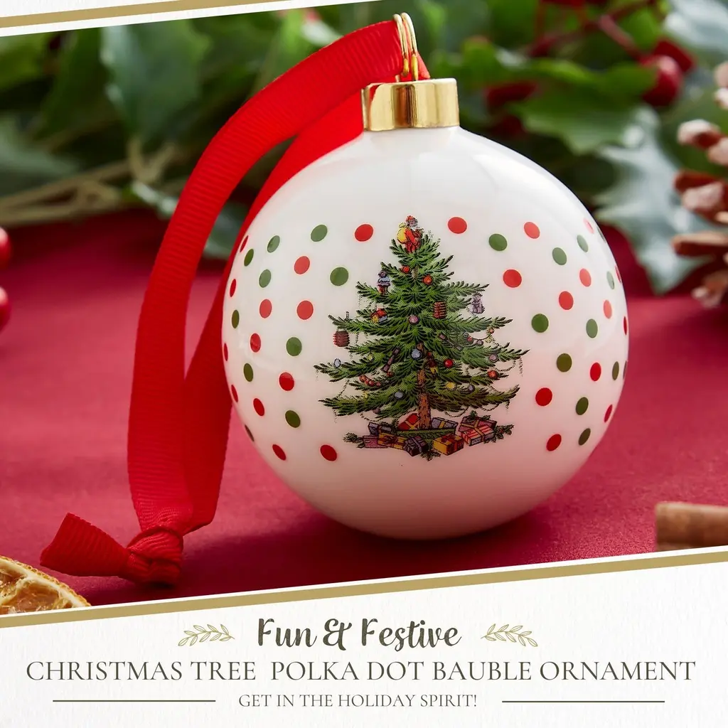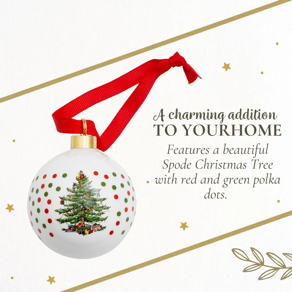 Spode Christmas Tree Polka Dot Bauble - Festive Porcelain Christmas Ornament with Red Ribbon, Hanging Ornament for Holiday Decor - Christmas Tree Decorations, Wreaths, Stocking Stuffers - NewSince 1938, Spode’s Christmas Tree collection has been a cherished part of holiday traditions, making this bauble a meaningful addition to any Christmas decor. Bring festive charm to your holiday season with the Spode Christmas Tree Polka Dot Bauble. This decorative porcelain ornament showcases the iconic Spode Christmas Tree, surrounded by playful polka dots that add a cheerful twist to the classic design. Crafted from durable porcelain, this ornament features intricate detailing and long-lasting quality, making it a collectible that can be enjoyed each holiday season. Whether you’re decorating your home or looking for a thoughtful gift, this ornament brings warmth and nostalgia to the holidays. The Spode Christmas Tree Polka Dot Bauble goes beyond the tree. Its versatile design allows it to be used as a stocking stuffer, a decorative accent on doorknobs - You can even use it to enhance your gift-wrapping by tying it onto presents, creating a personalized touch for loved ones. Part of the Spode Christmas Tree collection, this festive ornament continues a long-standing tradition of quality craftsmanship and joyful holiday designs. Whether you’re a collector or simply looking to add a bit of festive cheer to your home, the Spode Christmas Tree Polka Dot Bauble is the perfect way to celebrate the season. Add it to your holiday collection today and let it become a part of your family’s Christmas traditions.FEATURES:COLOR:MATERIAL:WHAT'S IN THE BOX:PACKAGING:Retail Packaging