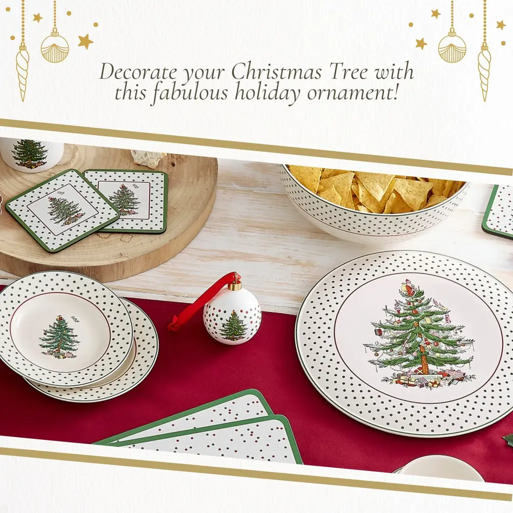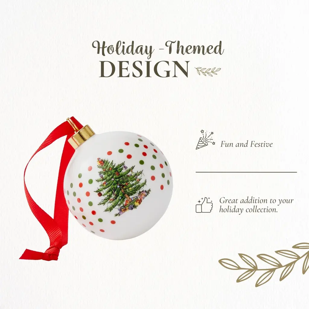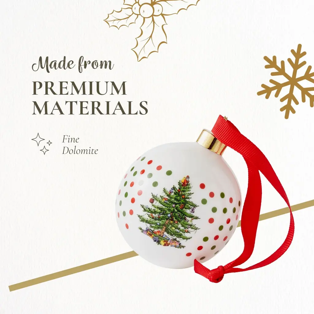 Spode Christmas Tree Polka Dot Bauble - Festive Porcelain Christmas Ornament with Red Ribbon, Hanging Ornament for Holiday Decor - Christmas Tree Decorations, Wreaths, Stocking Stuffers - NewSince 1938, Spode’s Christmas Tree collection has been a cherished part of holiday traditions, making this bauble a meaningful addition to any Christmas decor. Bring festive charm to your holiday season with the Spode Christmas Tree Polka Dot Bauble. This decorative porcelain ornament showcases the iconic Spode Christmas Tree, surrounded by playful polka dots that add a cheerful twist to the classic design. Crafted from durable porcelain, this ornament features intricate detailing and long-lasting quality, making it a collectible that can be enjoyed each holiday season. Whether you’re decorating your home or looking for a thoughtful gift, this ornament brings warmth and nostalgia to the holidays. The Spode Christmas Tree Polka Dot Bauble goes beyond the tree. Its versatile design allows it to be used as a stocking stuffer, a decorative accent on doorknobs - You can even use it to enhance your gift-wrapping by tying it onto presents, creating a personalized touch for loved ones. Part of the Spode Christmas Tree collection, this festive ornament continues a long-standing tradition of quality craftsmanship and joyful holiday designs. Whether you’re a collector or simply looking to add a bit of festive cheer to your home, the Spode Christmas Tree Polka Dot Bauble is the perfect way to celebrate the season. Add it to your holiday collection today and let it become a part of your family’s Christmas traditions.FEATURES:COLOR:MATERIAL:WHAT'S IN THE BOX:PACKAGING:Retail Packaging