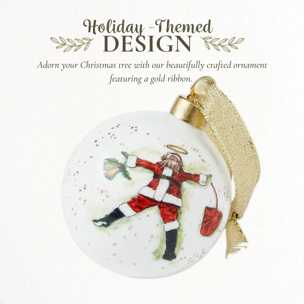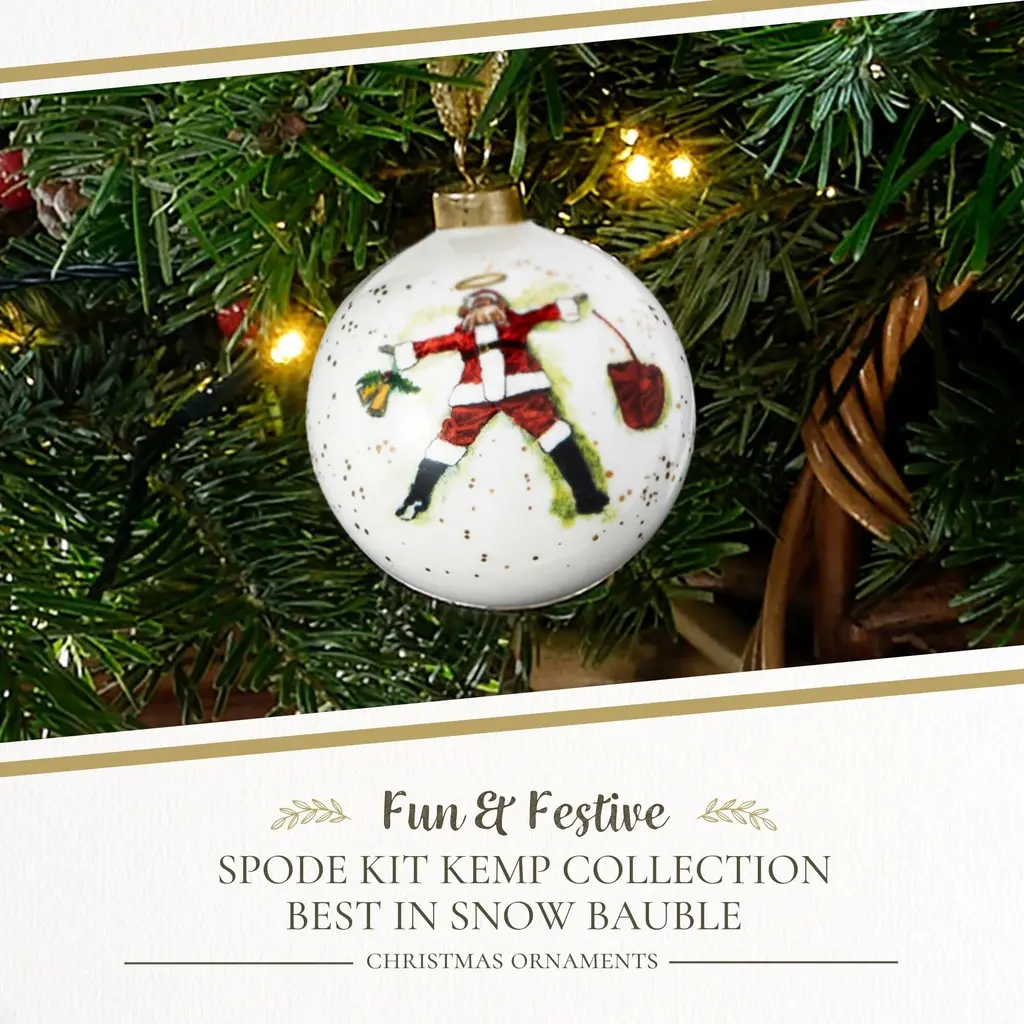 Spode Kit Kemp Christmas Ornament - Doodles Best In Snow - Fine China Whimsical Festive Keepsake, Collectible Holiday Decoration for Tree & Seasonal Decor - Holiday Ornament for Gift Giving - NewStep into the enchanting world of the Kit Kemp Collection by Spode, where timeless tradition intertwines with contemporary elegance. Whether adorning your tree or gracing the mantel, these ornaments are bound to ignite joy and spirited conversations. Elevate your holiday festivities with the Kit Kemp Collection by Spode, where each piece embodies the seamless fusion of tradition and modern allure. Christmas ornaments elevate holiday decor by adding personality, warmth, and charm to any space. Whether you choose personalized holiday ornaments that reflect family traditions, or handmade Christmas decorations that showcase craftsmanship, ornaments bring a festive spirit to your home. Holiday ornament sets can unify a theme, while vintage Christmas ornaments add nostalgia, making your decor not only visually appealing but also deeply meaningful and memorable. Adding a whimsical touch to your tree, this Christmas Doodle ornament features an endearing illustration of Santa making snow angels, exclusively designed by Willow Kemp for Spode. Crafted from porcelain, this ornament comes complete with a gold ribbon, ideal for hanging on the tree or adorning the mantel. Not confined to the tree alone, this ornament serves as a delightful addition to any holiday gift, promising to infuse each present with seasonal cheer. Packaged in a beautifully designed gift box, it's the perfect gesture for friends and family, destined to enhance their festive celebrations. Immerse yourself in the enchantment of the Kit Kemp Collection by Spode and usher in the joy of the holiday season.FEATURES:COLOR:MATERIAL:WHAT'S IN THE BOX:PACKAGING:Retail Packaging