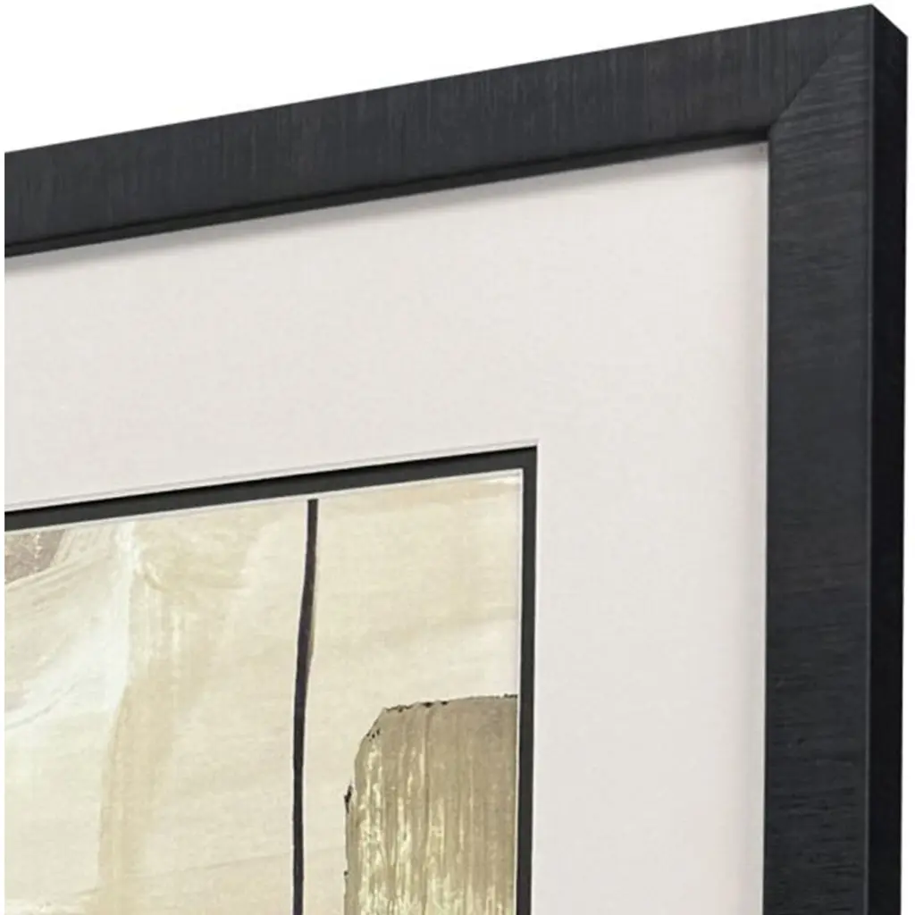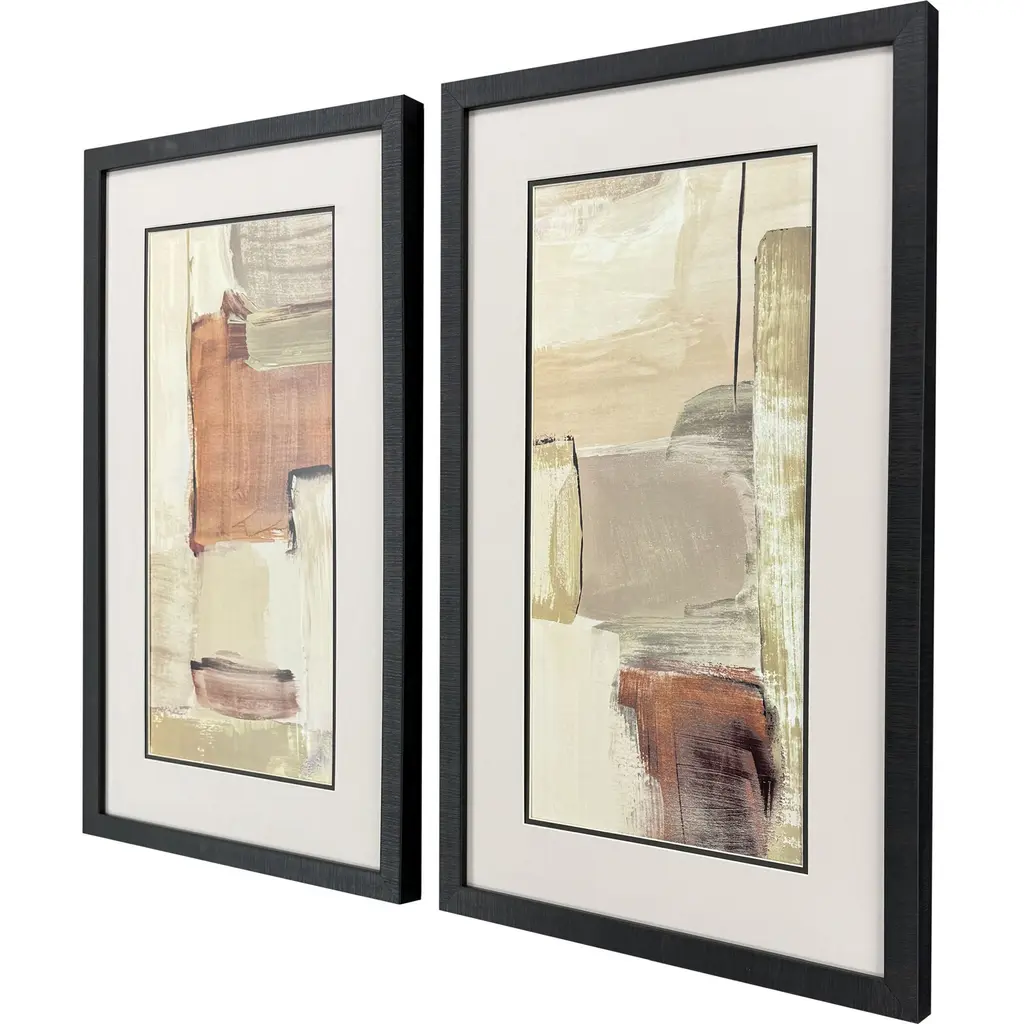 Neutral color block geometric prints are double matted in putty and espresso. They are framed in a dark espresso wood finish molding.