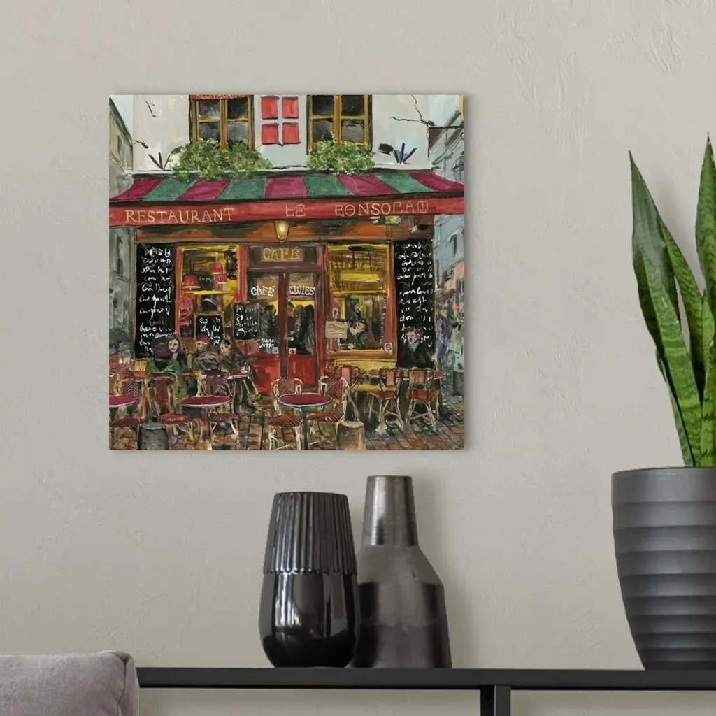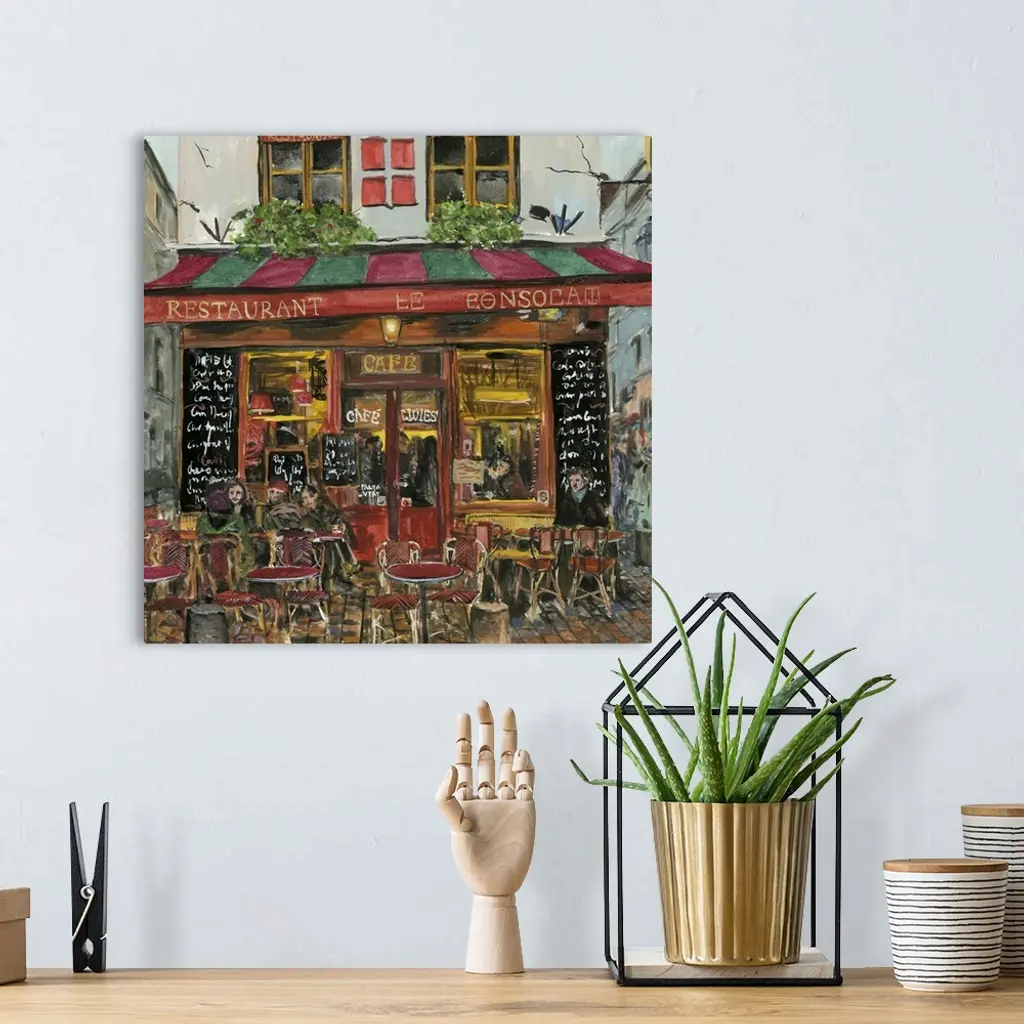 A square decorative image of people sitting outside a red and green cafe in France.