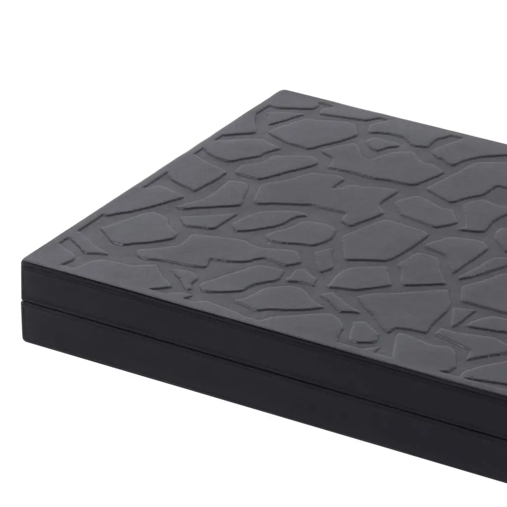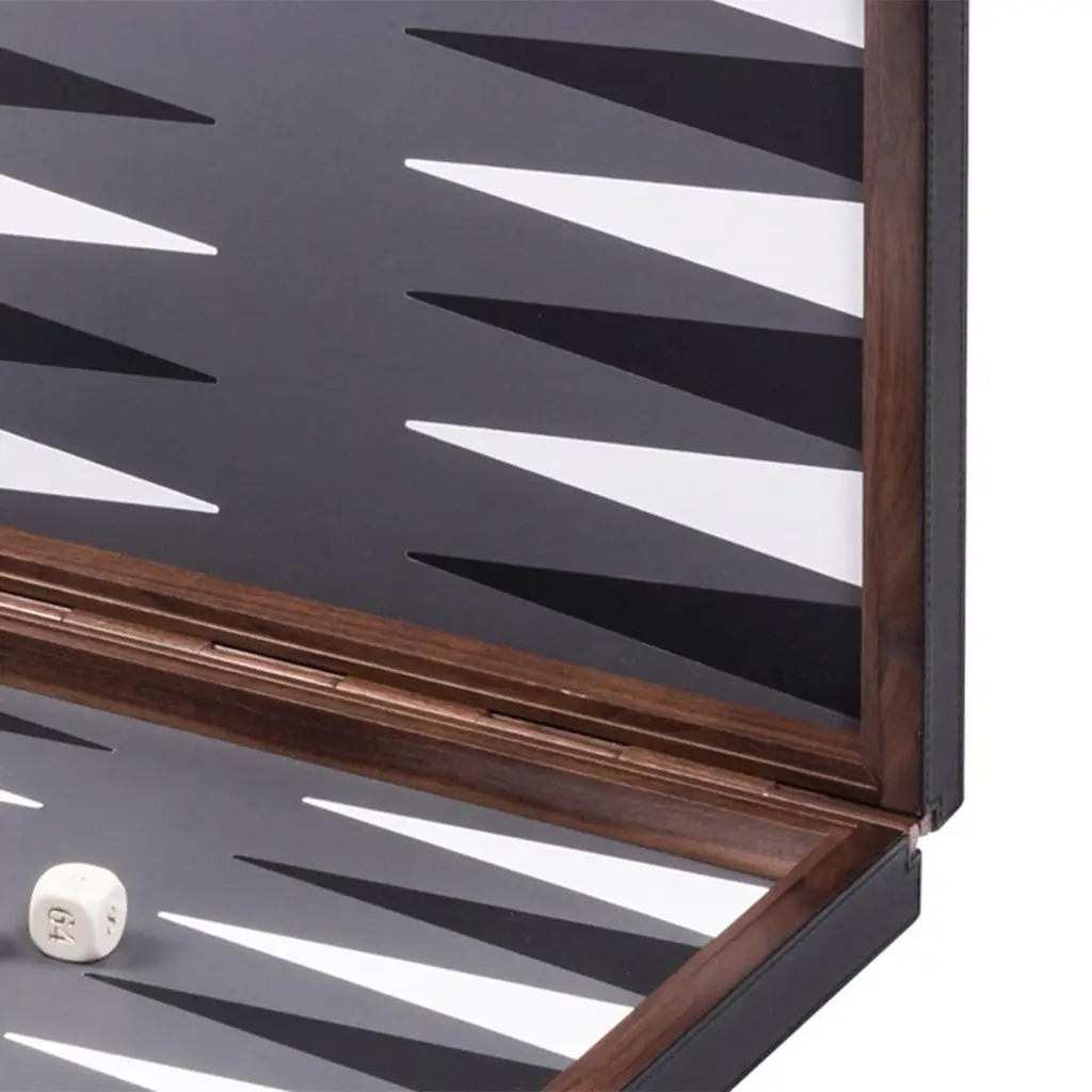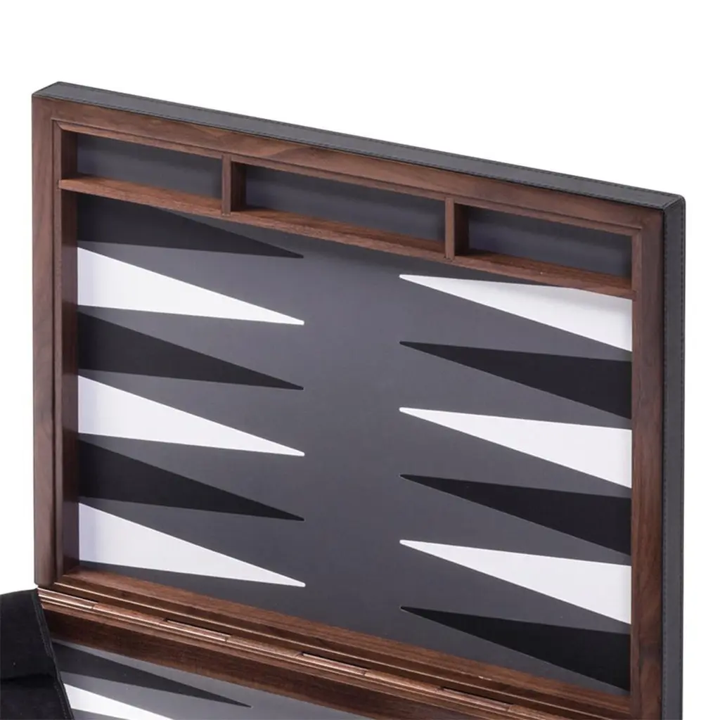 Backgammon spotted with solid walnut case. Backgammon lid's covered with genuine leather with a spotted pattern in relief. With magnetic closing system.With leather inlaid playing surface. Game include a boxwood checkers and dices.