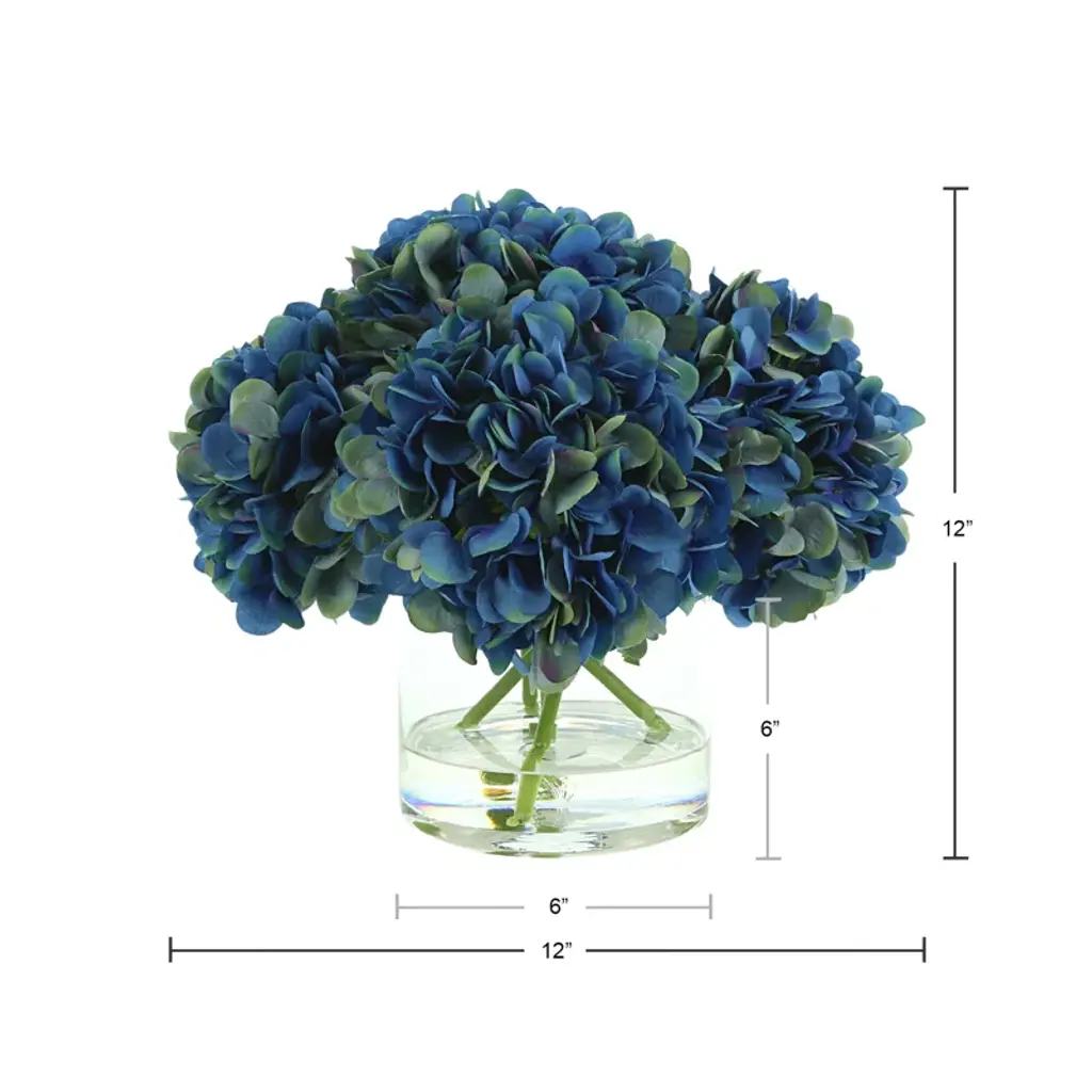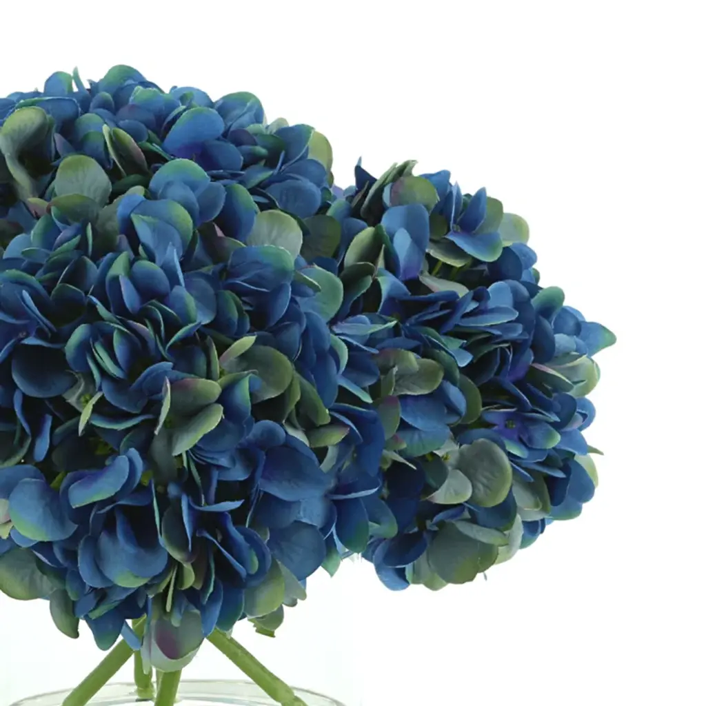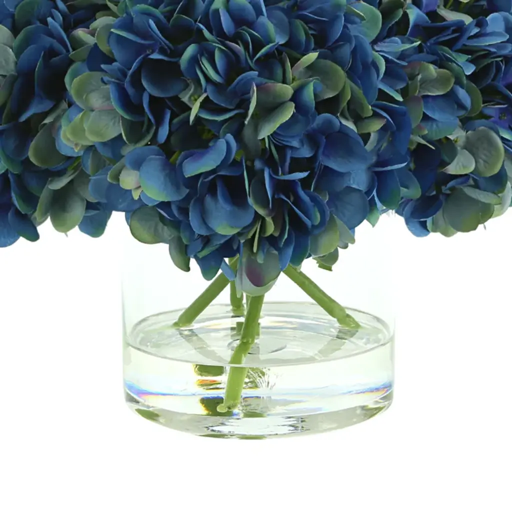 Fauxe Hydrangea cuttings in an acrylic water glass vessel look like they just came in from your garden.