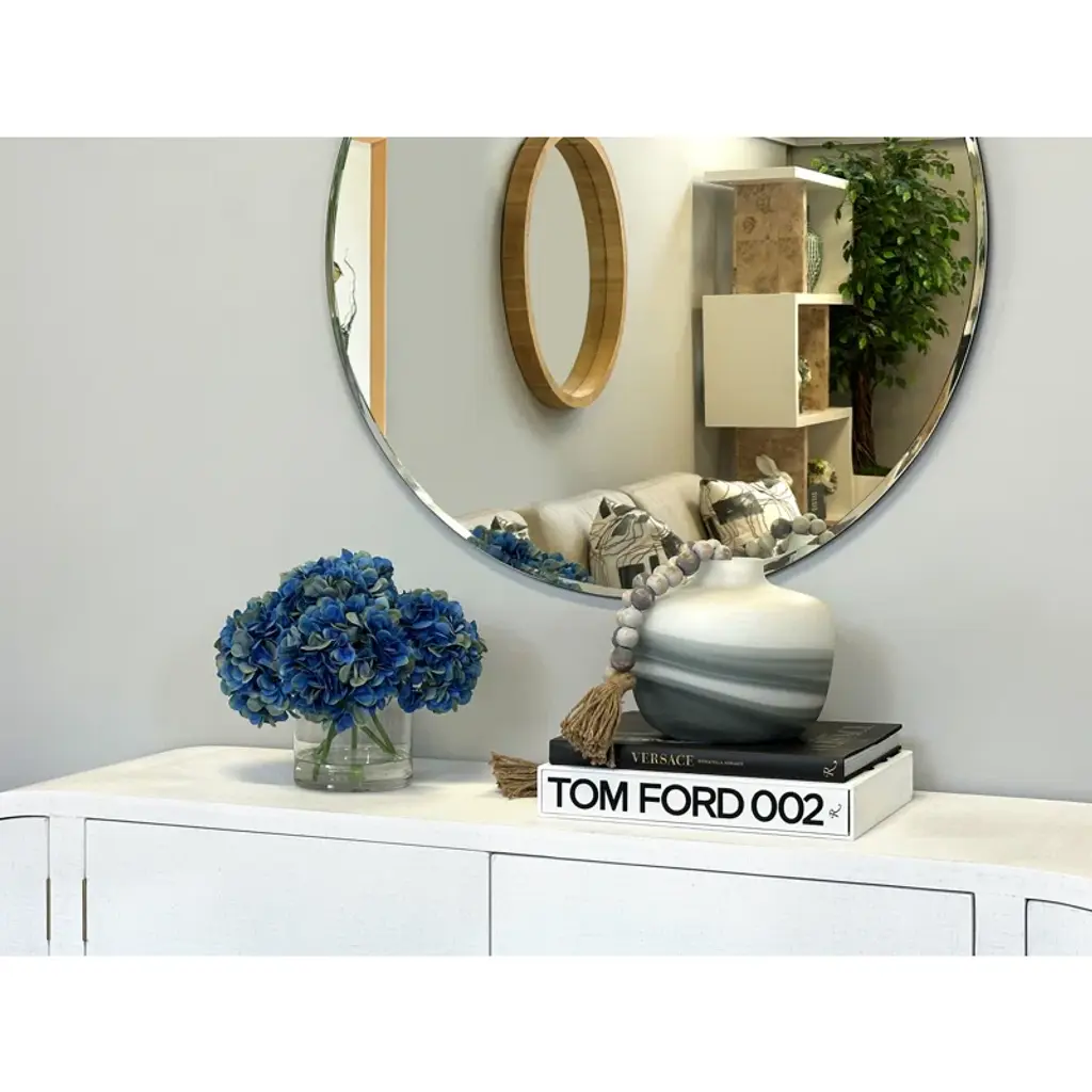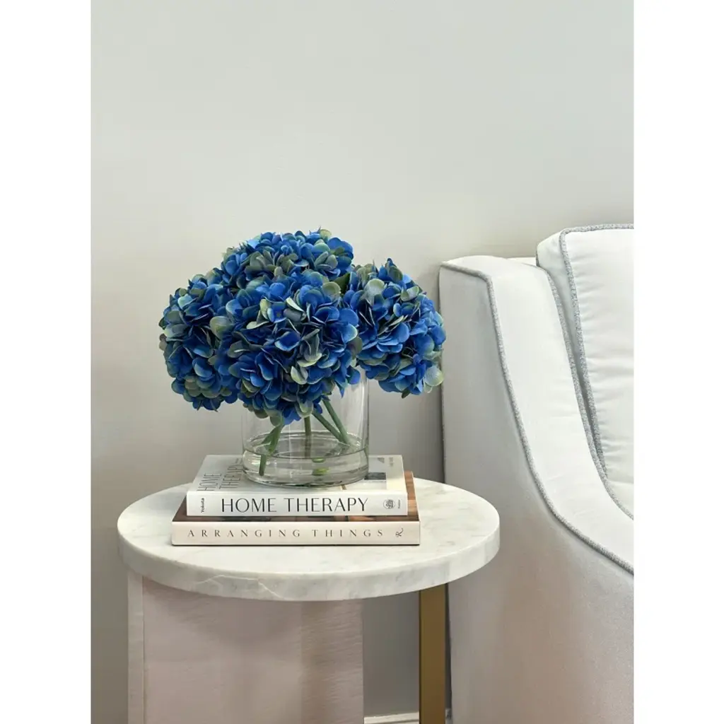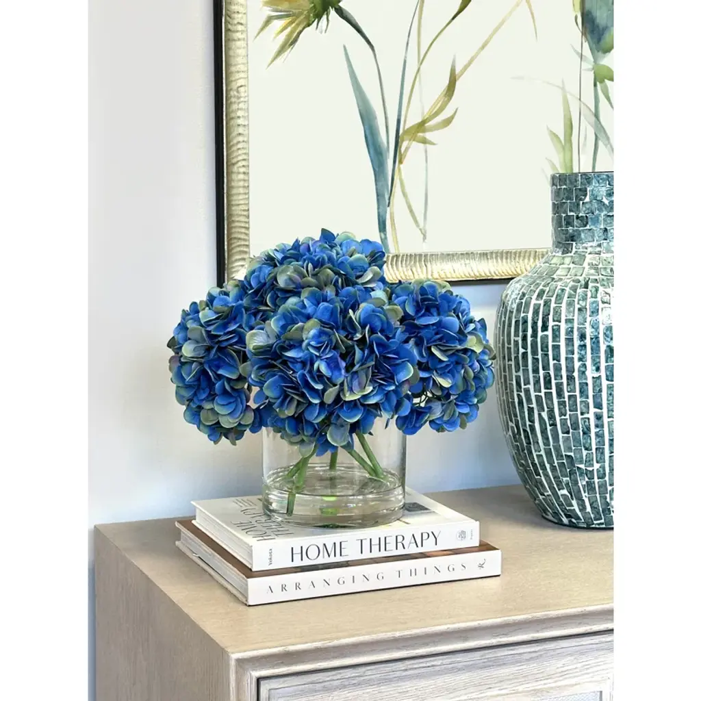 Fauxe Hydrangea cuttings in an acrylic water glass vessel look like they just came in from your garden.
