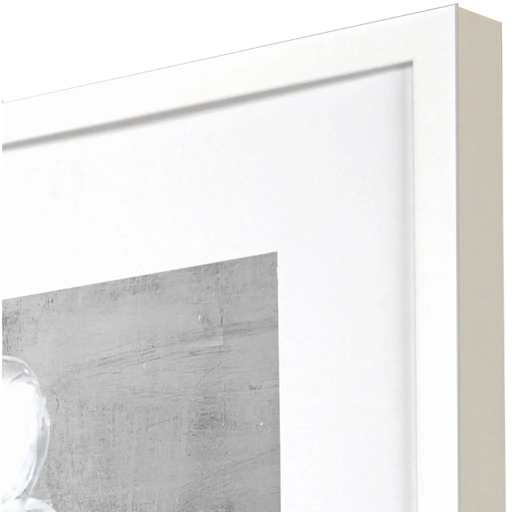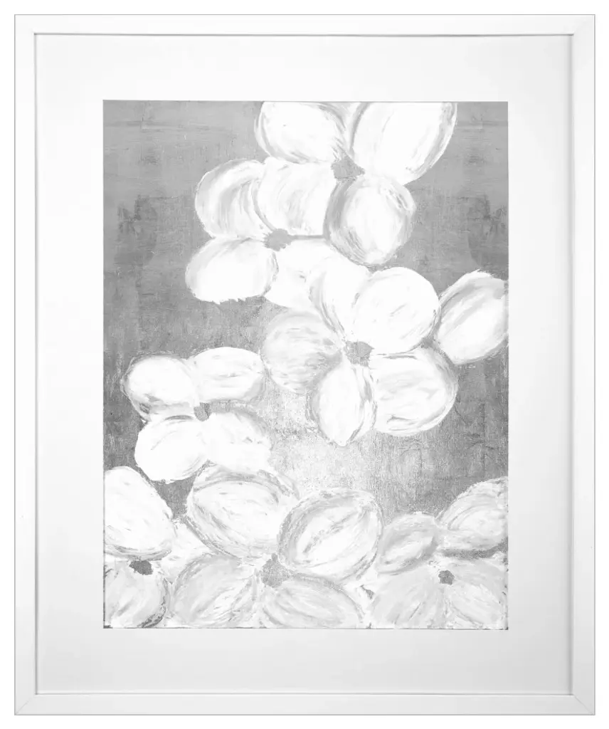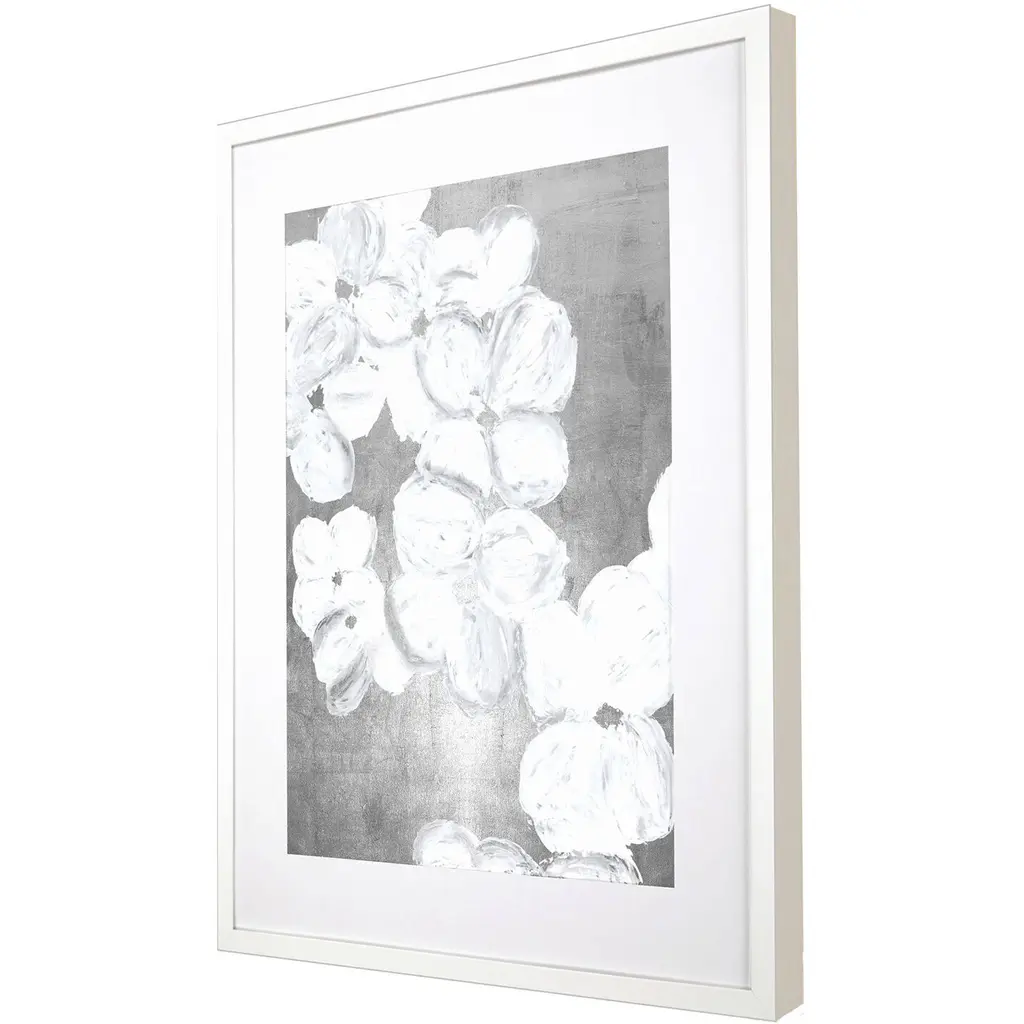 Hand embellished giclee with silver leaf. Framed in a lacquered white wood shadow box style moulding.