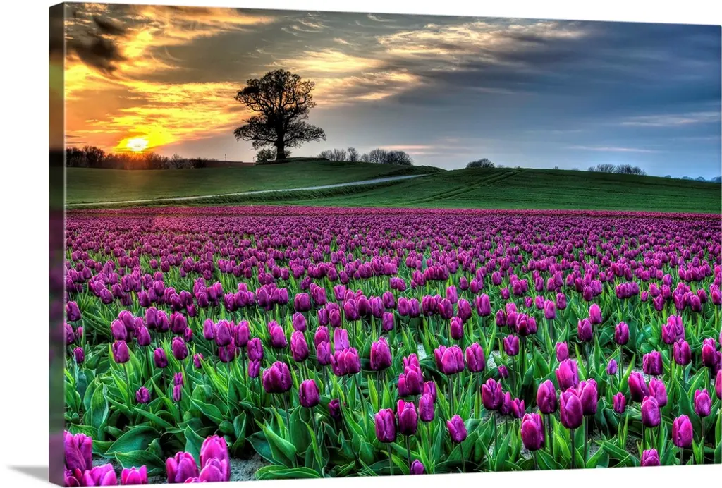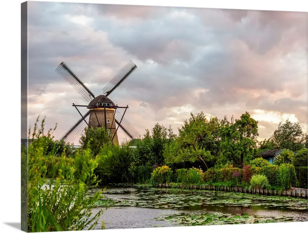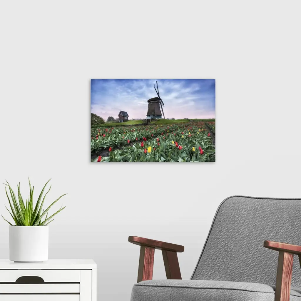Spring Clouds On Fields Of Multicolored Tulips And Windmill, Netherlands