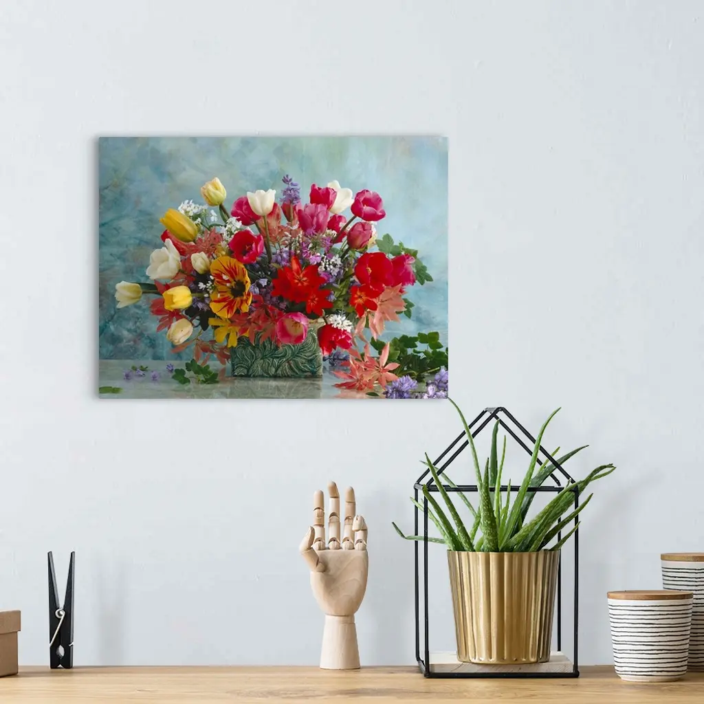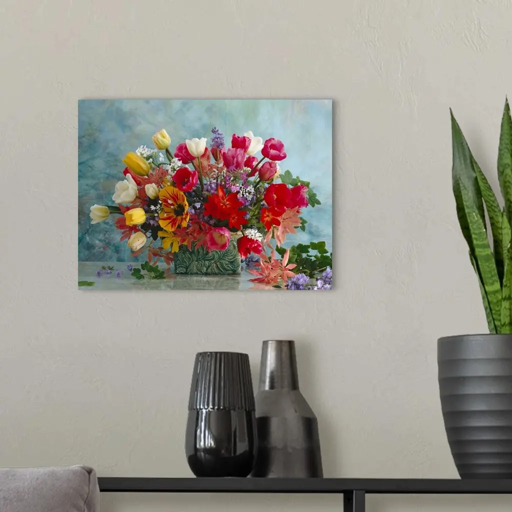 Spring flower bouquet of Tulip, Hyazinthus, Allium, Pieris, and Hesperis wall art for home and office decor. Discover canvas art prints, photos, mural, big canvas art and framed wall art in GreatBigCanvas.com's varied collections.