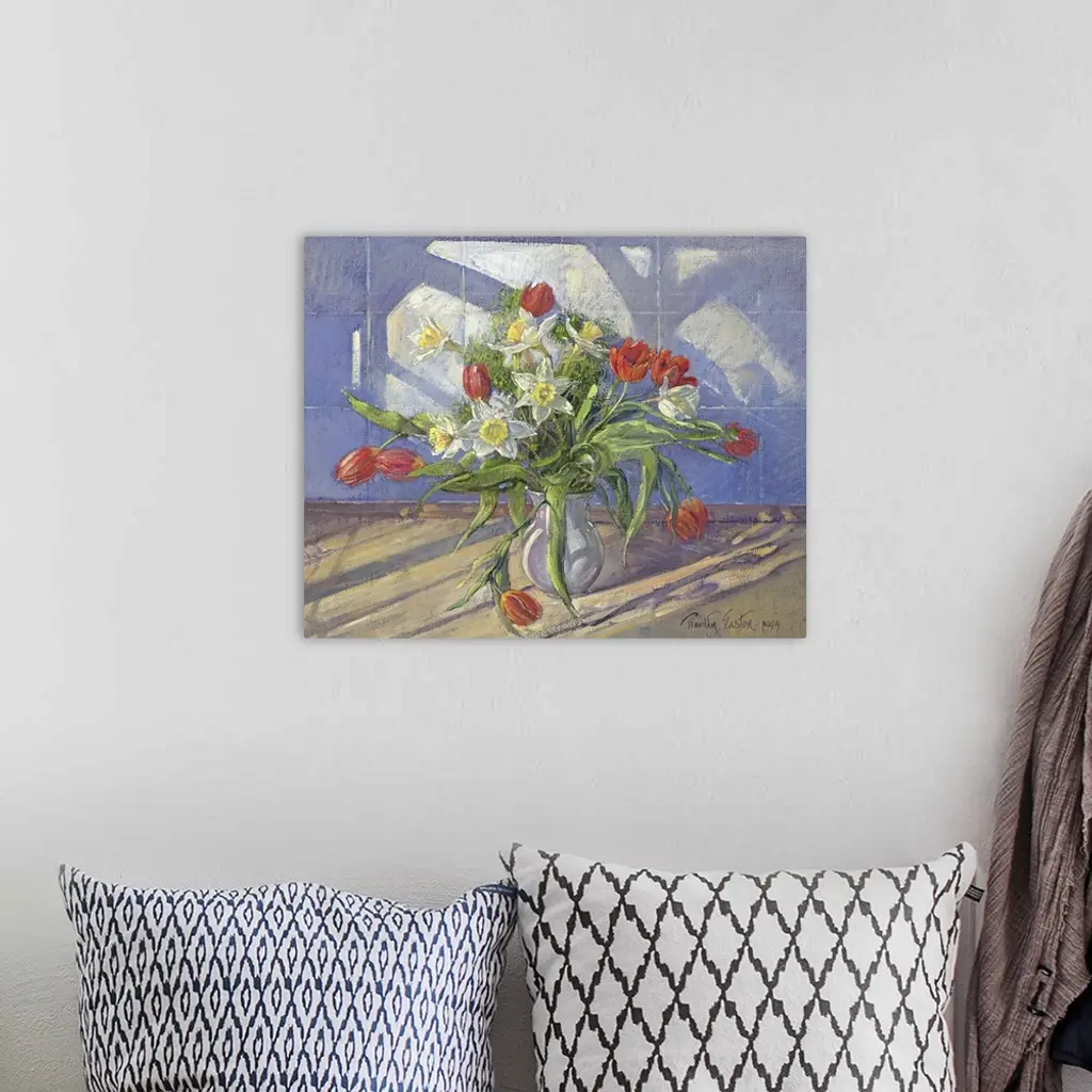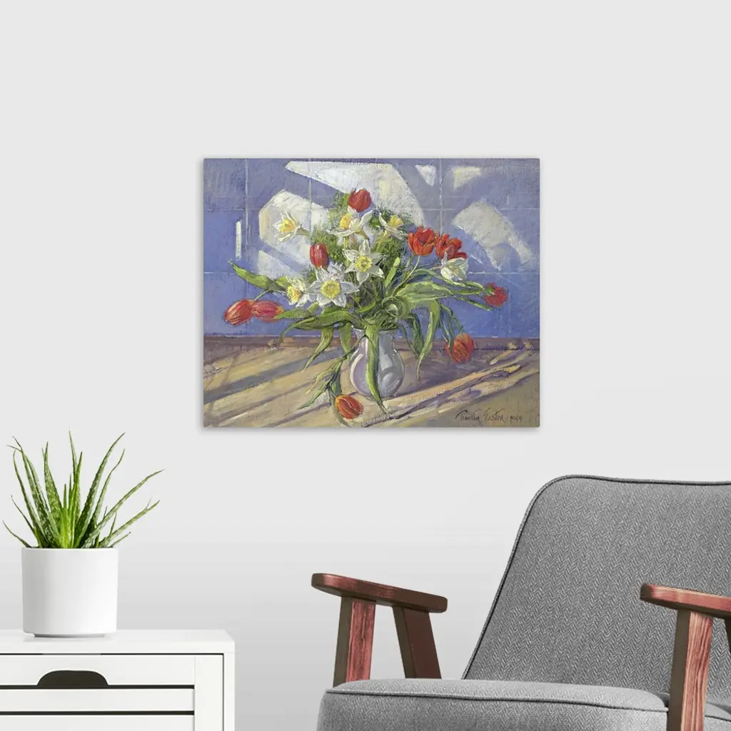 EAS130763 Spring Flowers with Window Reflections, 1994 (oil on canvas) by Easton, Timothy ; Private Collection; English, in copyright..PLEASE NOTE: Bridgeman Images represents the copyright holder of this image and can arrange clearance.