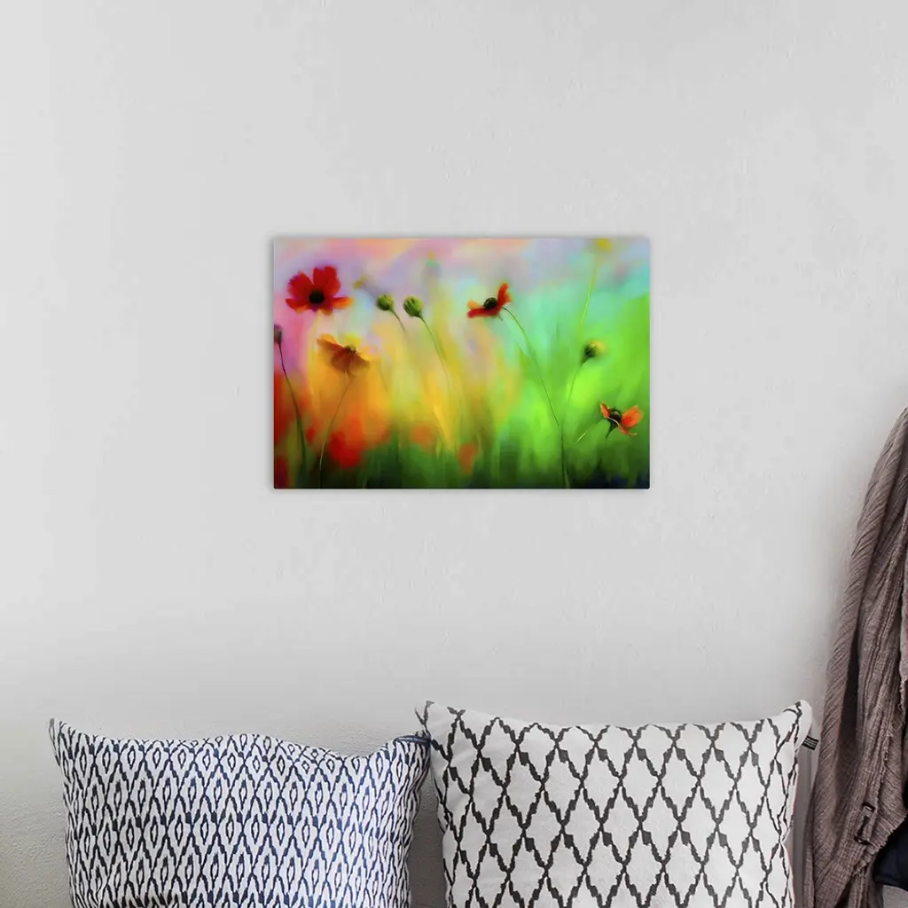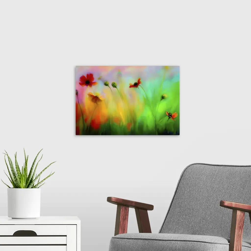 Vivid flowers in shades of red and orange stand against a blurred background of greens and blues, giving an impressionistic feel. The soft gradients and gentle focus evoke a sense of tranquility and natural beauty.