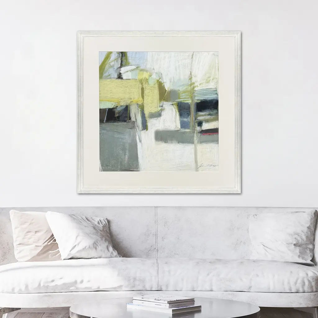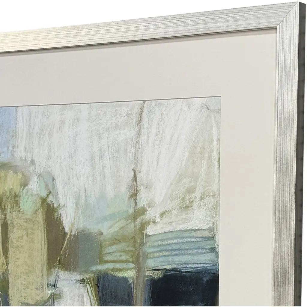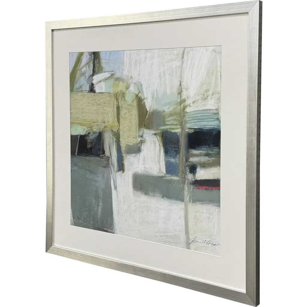 A geometric abstract with green and white color tones is matted in light buff. Giclee is framed in a silver leaf block profile wood.