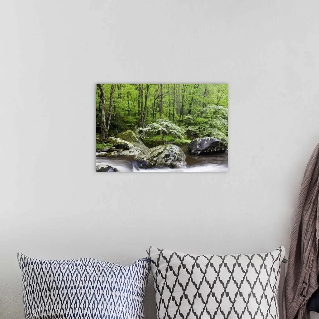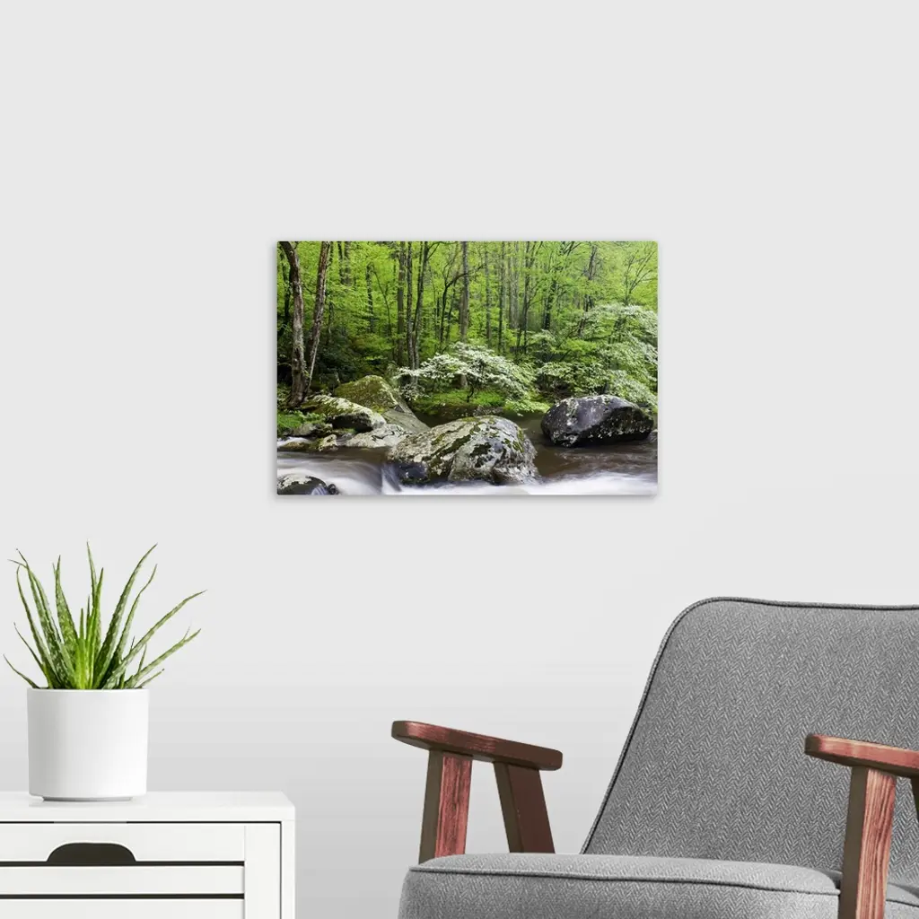 Thick forest lines the back of this photograph which has rushing water flowing over and in between large rocks.