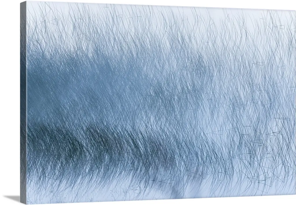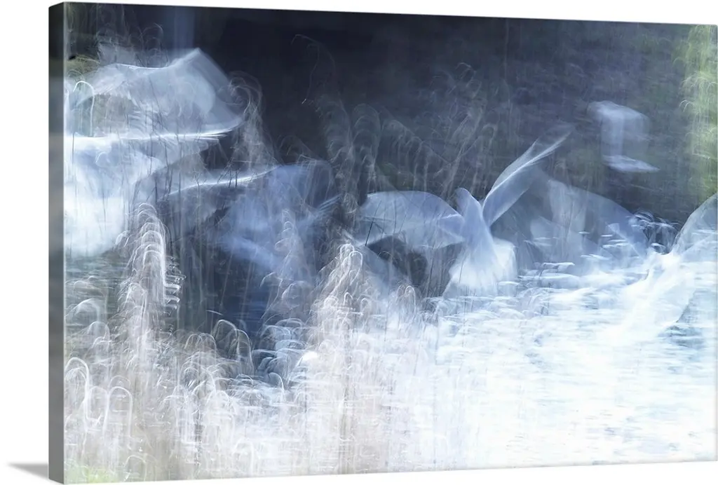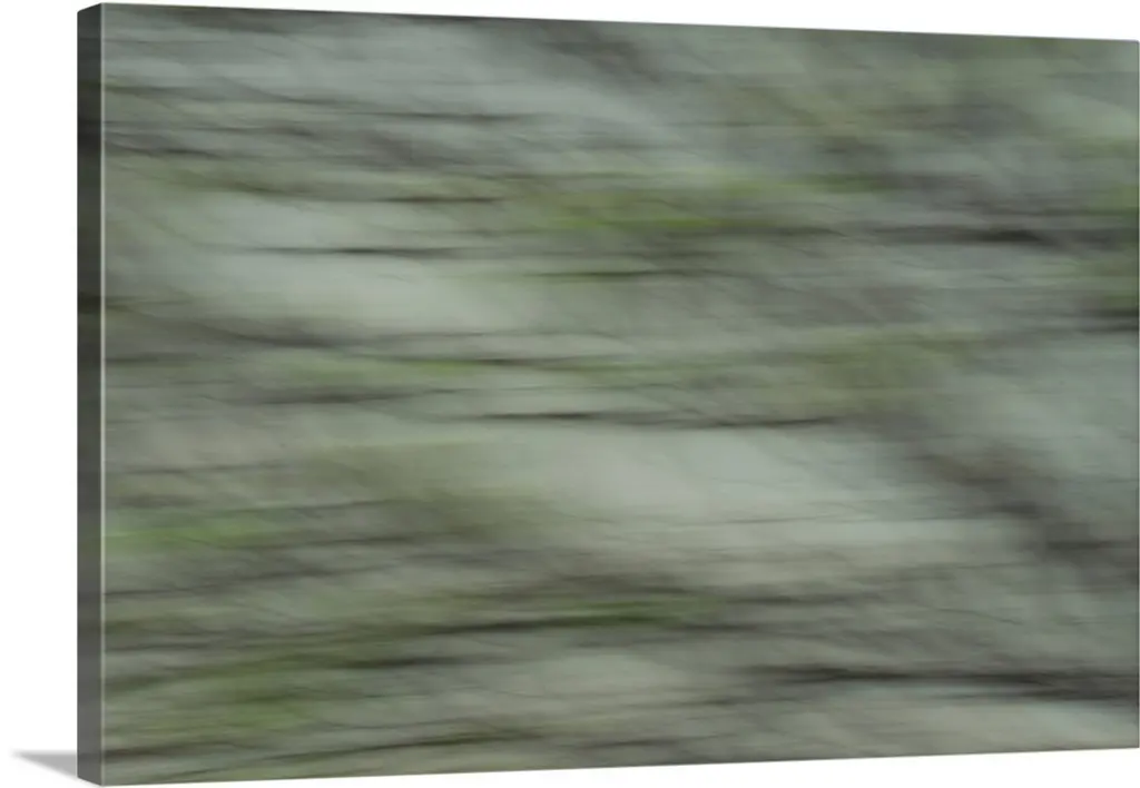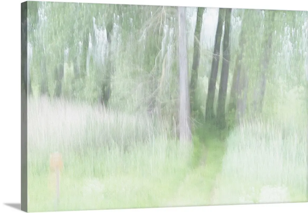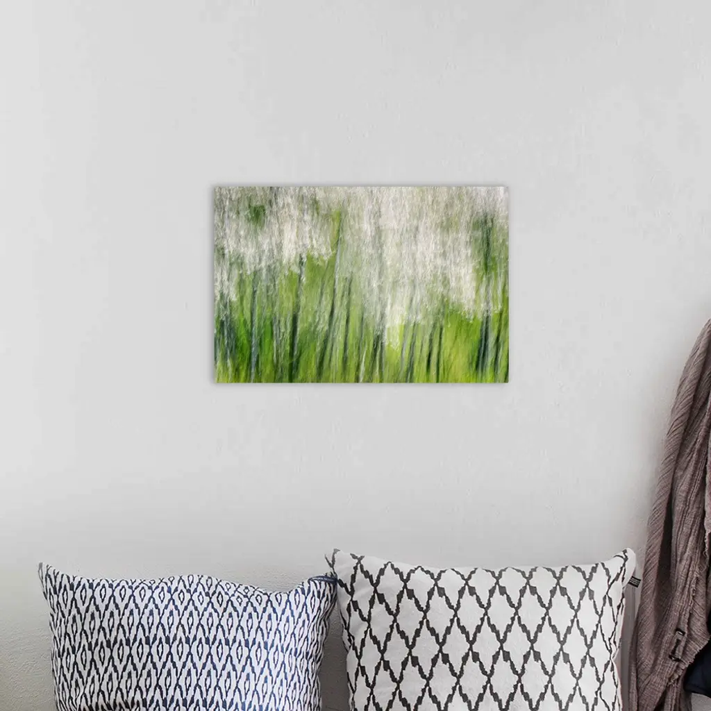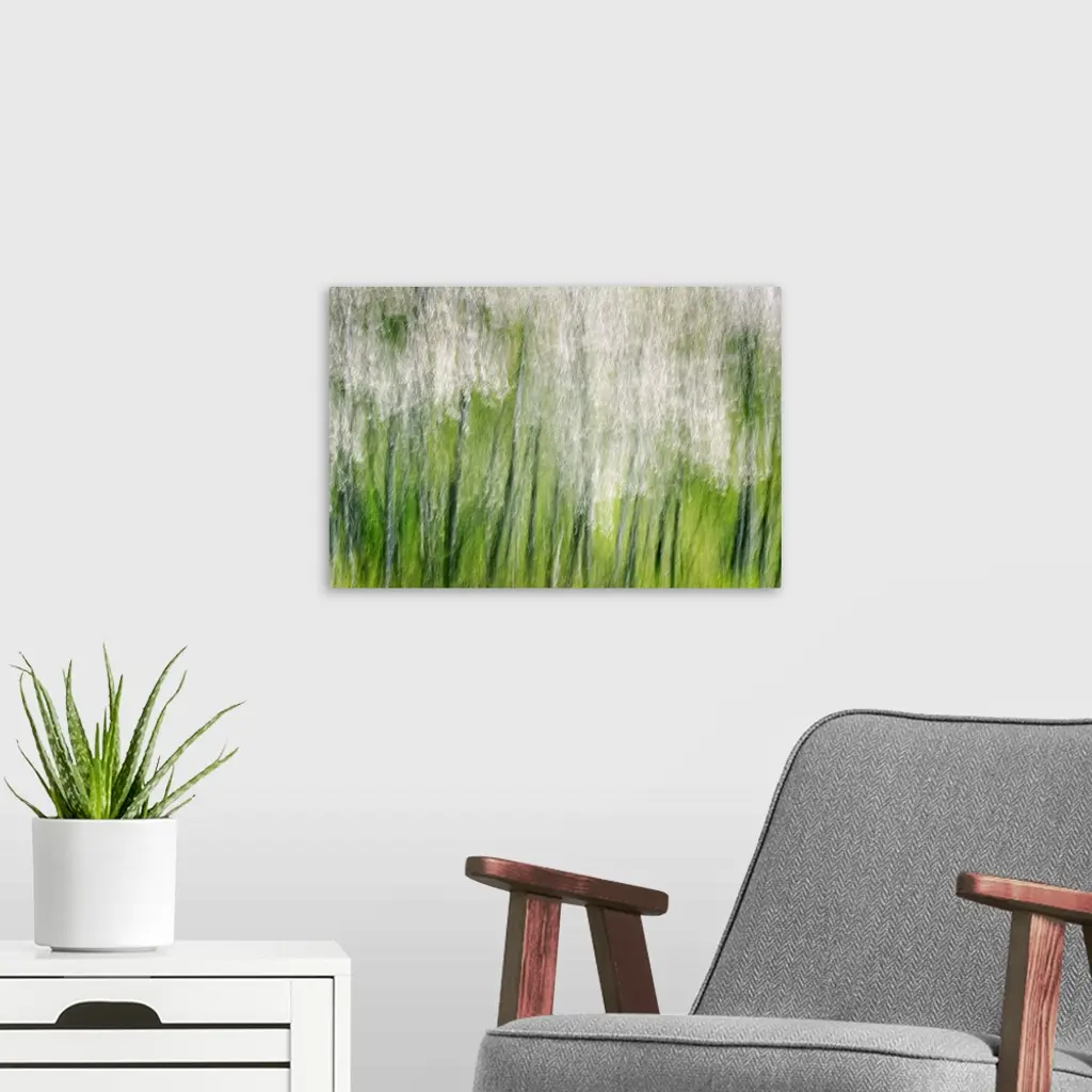 Blurred motion image of a a row of blossoming trees, creating an abstract image.