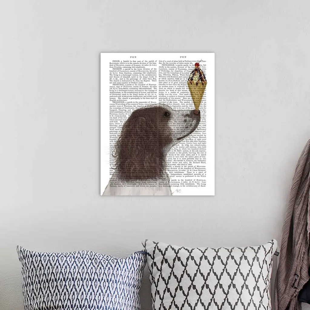 Decorative artwork of a brown and white Springer Spaniel balancing an ice cream cone on its nose, painted on the page of a book.