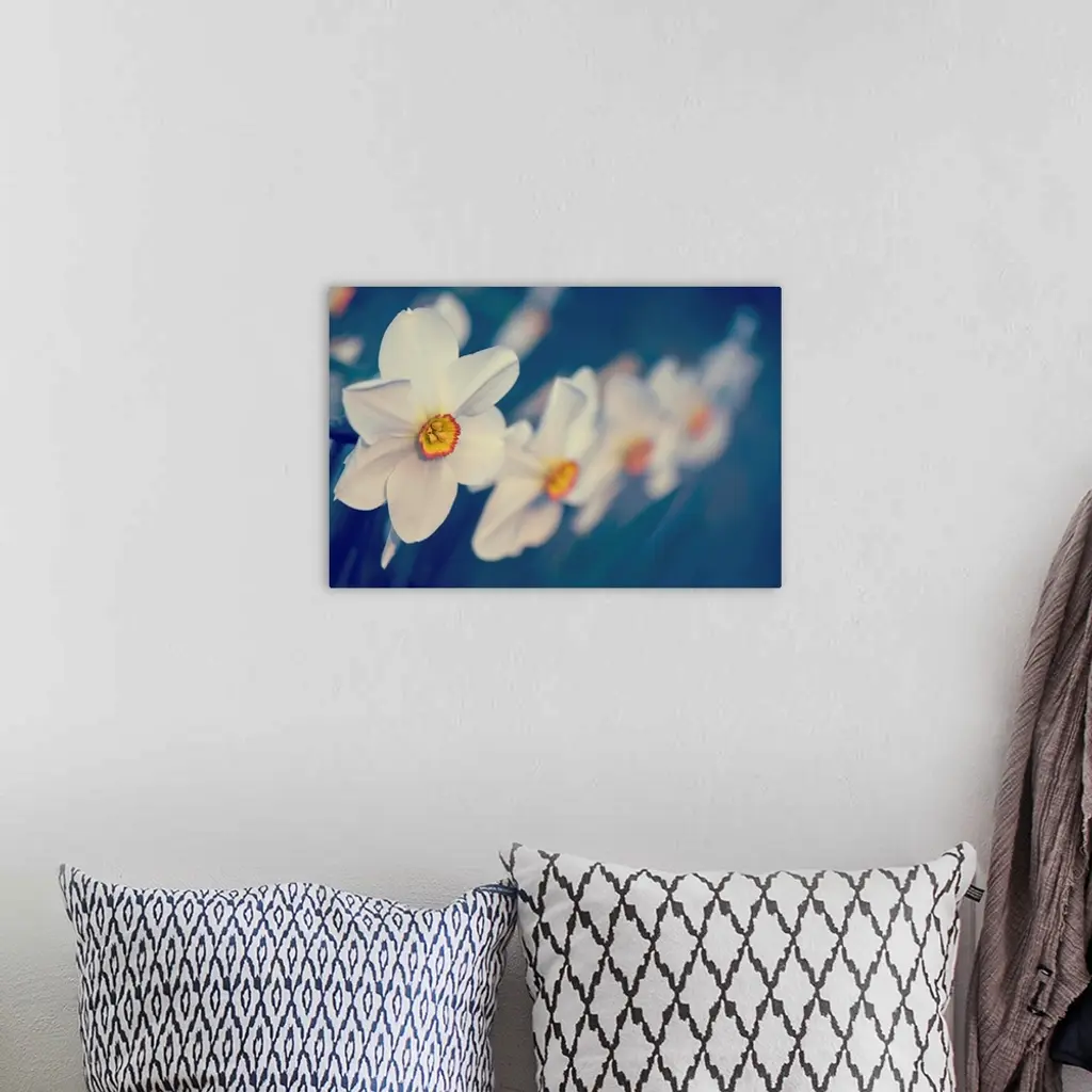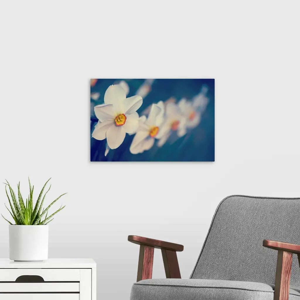 Horizontal photograph on a large wall hanging of big, blooming flowers in a row, focus becomes softer on the right side of the image, with only the far left flower being completely in focus.