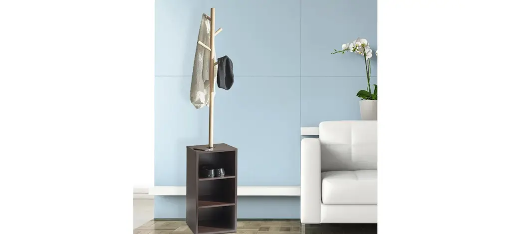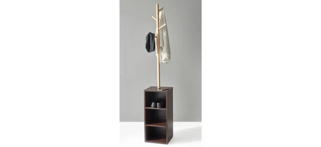 An organizational solution for a small space, or a way to tidy up the entry way in style, the Sprouts Coat Rack white Storage Cubbie provides 4 functional coat hooks as well as 3 storage cubbies. A convenient place to store shoes or accessories, this storage piece allows for easy access on the way out the door. Mixing natural and walnut wood finishes, this Hutch Storage Coat Rack is not only super functional, but can fit into a variety of different room decors with style.
