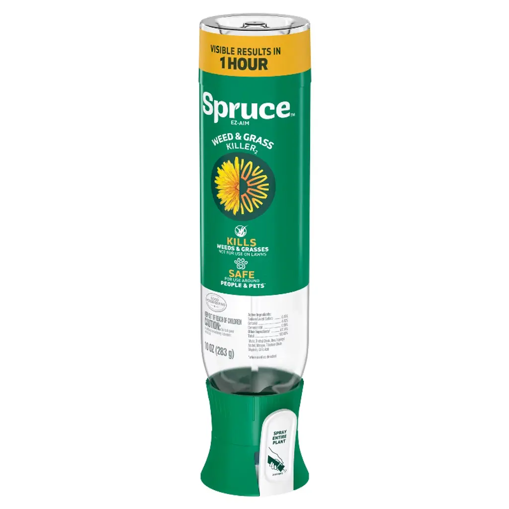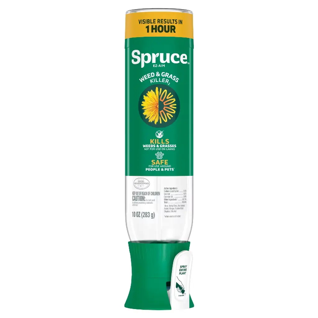 Spruce Weed & Grass Killer is the hard working, worry-free weed solution. Spruce is a fast-acting weed killer that works on contact, with visible results in 1 hour. The powerful formula works differently than most weed killers, using dehydration to kill weeds. Spruce is safe for use around people and pets when used as directed. Spruce is also backed by the Good Housekeeping seal. Spruce kills all types of weeds and grasses, including dandelions, large crabgrass, white clover, dollarweed, and morning glory. The EZ-Aim applicator delivers a precise, continuous spray perfect for spot treatment of stubborn weeds in cracks and edges, as well as on-the-go maintenance of mulch beds, driveways, and paver stones; it is not designed for use on lawns. The 10oz bottle can treat up to 60 weeds, and should be sprayed on the entire plant, not just the root. Love Spruce or get your money back. *Visit www.spruceguarantee.com for full terms.