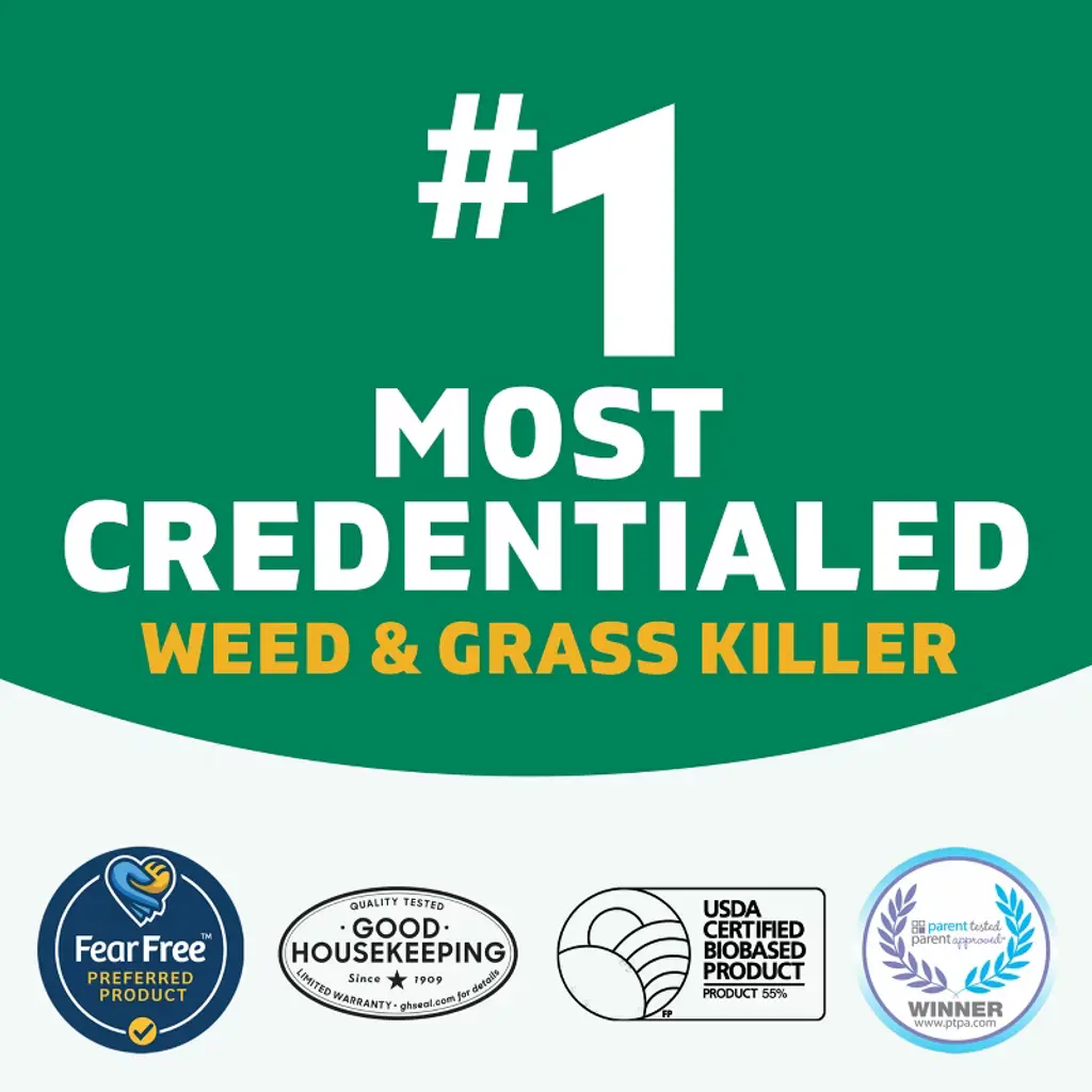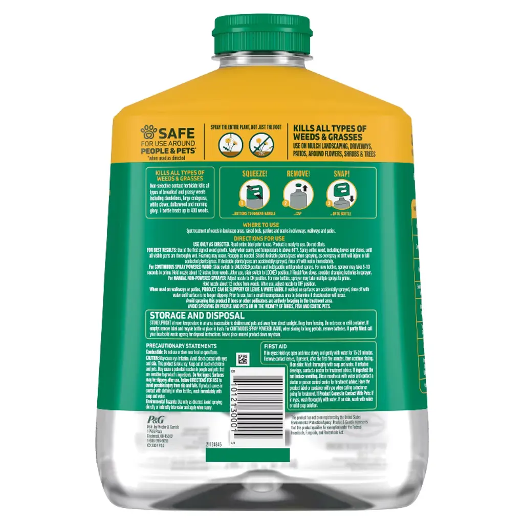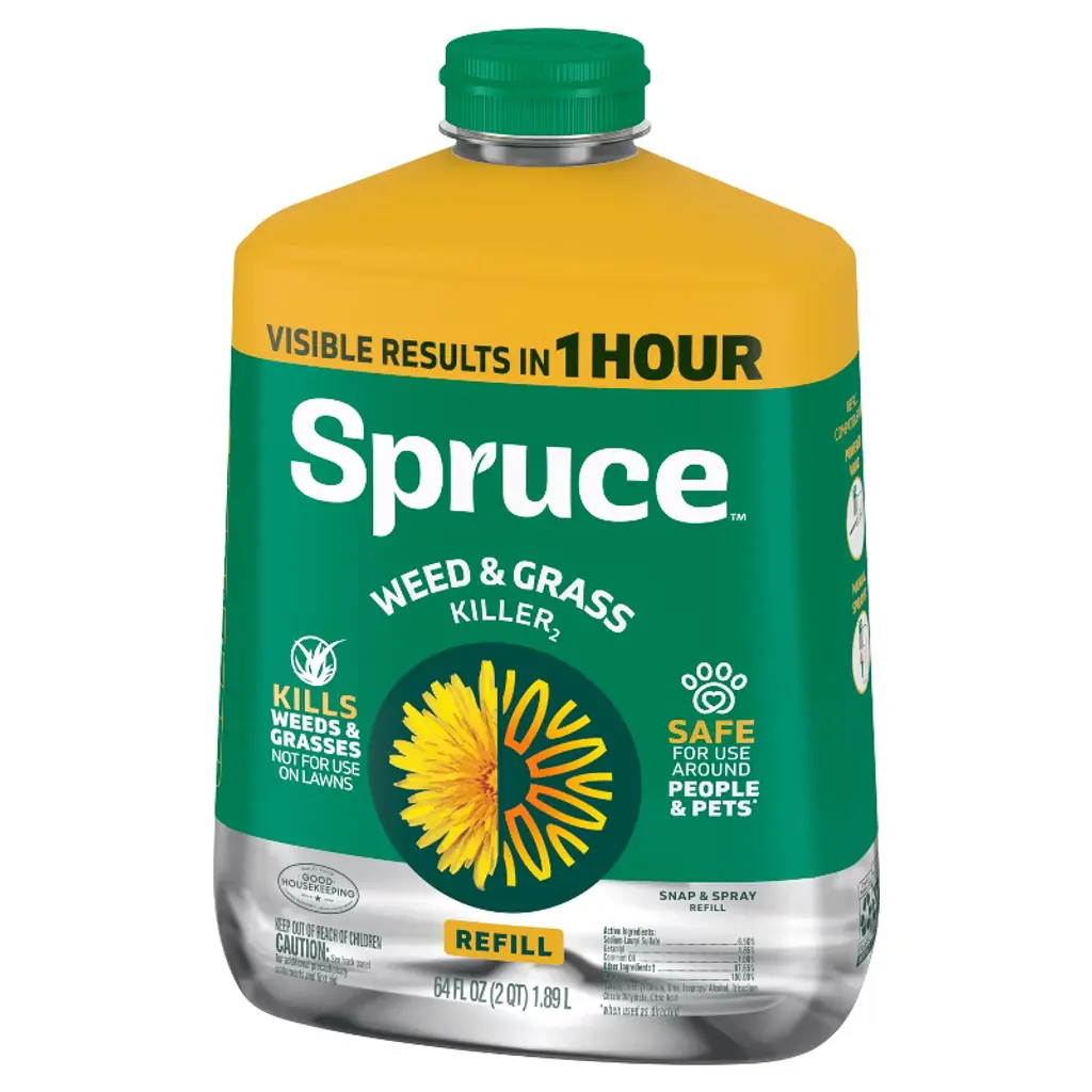 Spruce Weed & Grass Killer is the hard working, worry-free weed solution. Spruce is a fast-acting weed killer that works on contact, with visible results in 1 hour. The powerful formula works differently than most weed killers, using dehydration to kill weeds. Spruce is safe for use around people and pets when used as directed. Spruce is also backed by the Good Housekeeping seal. Spruce kills all types of weeds and grasses, including dandelions, large crabgrass, white clover, dollarweed, and morning glory. This 64oz refill is designed for use with the Power Wand or Manual Sprayer—no mixing or pouring necessary. To use, simply squeeze the top of the empty bottle and remove it, snap in the refill, and spray! The 64oz bottle can treat up to 400 weeds, and should be sprayed on the entire plant, not just the root. Love Spruce or get your money back. *Visit www.spruceguarantee.com for full terms.