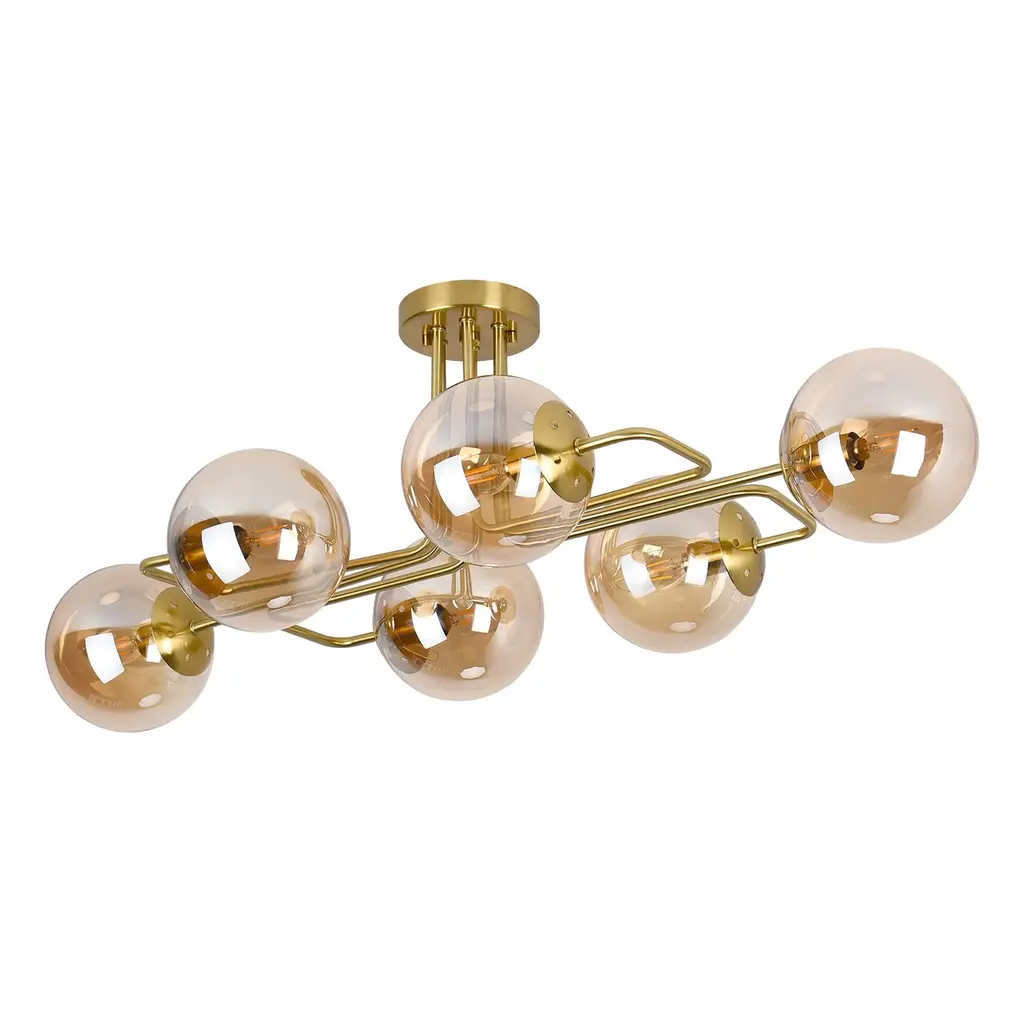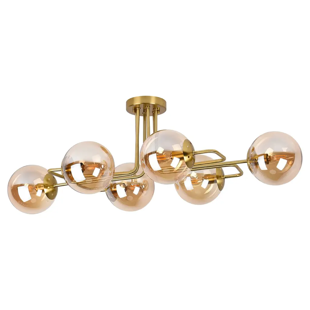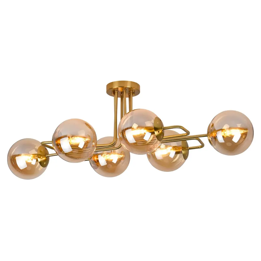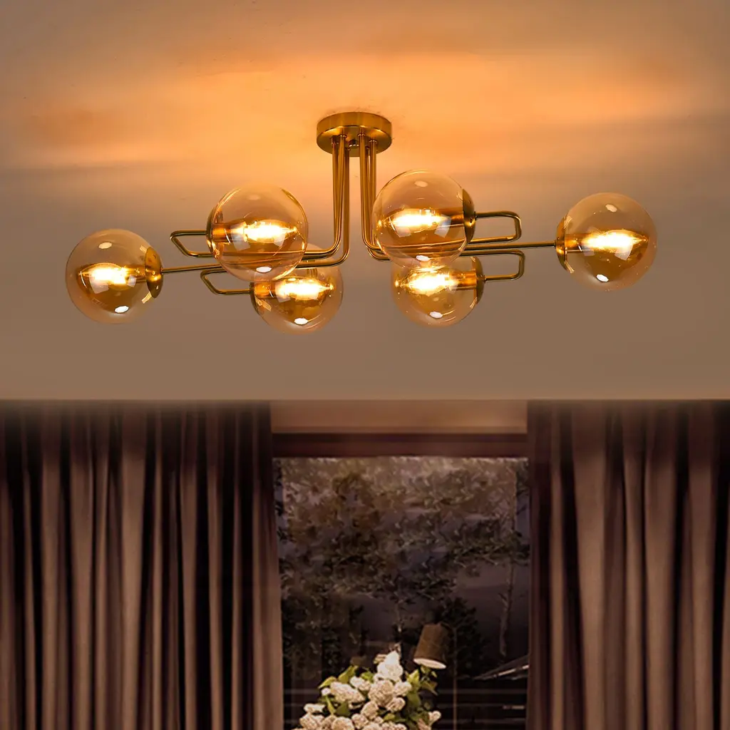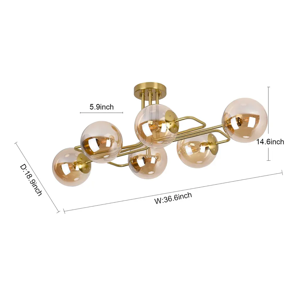 Detail:Add a touch of modern sophistication to your space with this semi-flush mount ceiling light, featuring a sleek antique brass finish and elegant globe glass shades. Its minimalist yet eye-catching design seamlessly blends contemporary and classic styles, making it a perfect addition to any room. Crafted to fit E12 candelabra bulbs (not included), this light creates a warm and inviting atmosphere, perfect for dining rooms, bedrooms, or living spaces. The timeless appeal of this fixture ensures it will complement a variety of interior décors, offering both functionality and style. Feature:Convenient installation: The product is equipped with detailed and easy to understand installation instructions and a full range of installation accessories, the installation steps are simple and clear, no need for professional electrician skills, easy to complete the installation, saving time and energy.Bulb configuration: E12 specification bulbs, a total of 4 lamps and 6 lamps respectively, can provide appropriate lighting brightness to meet the daily lighting needs, and replace the bulb is convenient and quick.Fashionable Appearance: Golden metal body with transparent glass globe lampshade, presenting a modern style of simplicity without loss of luxury, and exquisite modeling adds fashionable and artistic atmosphere to the space.Widely applied: Suitable for a variety of indoor scenes, such as cozy bedrooms, elegant study rooms, stylish studios, etc. Whether it is used as the main lighting or auxiliary lighting, it can be perfectly integrated into the environment.Quality guarantee: Made of high quality materials, the lamp body is sturdy and durable, the glass shade has delicate texture and exquisite craftsmanship, good stability and corrosion resistance, long service life.Product Dimension:4 - Lights 6 - Lights
