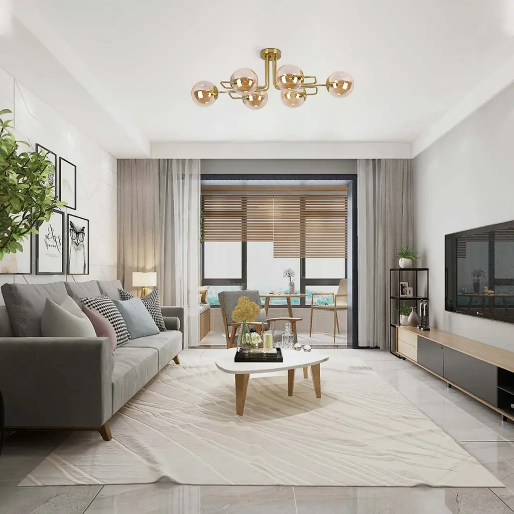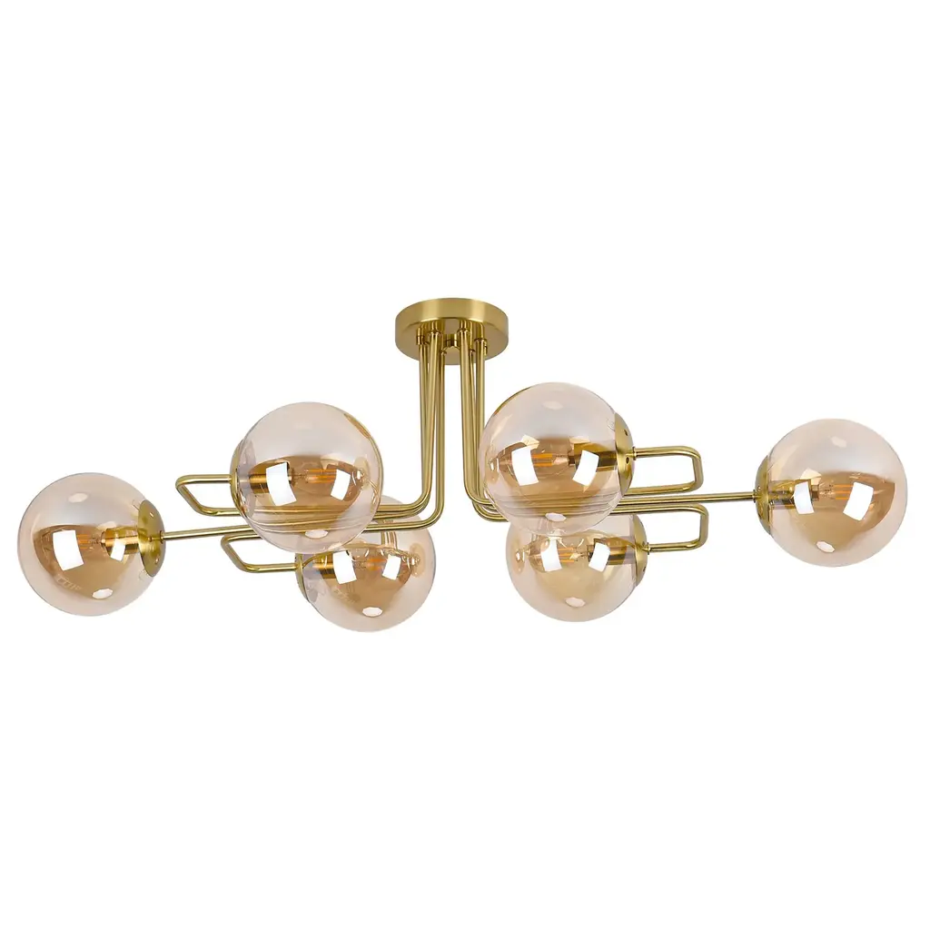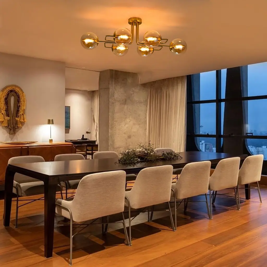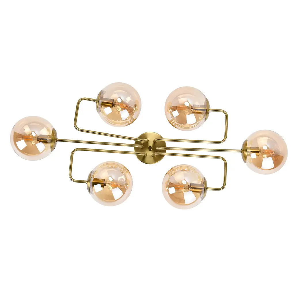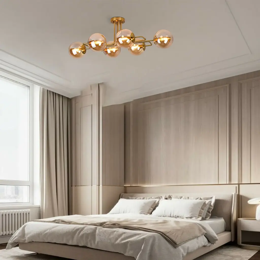 Detail:Add a touch of modern sophistication to your space with this semi-flush mount ceiling light, featuring a sleek antique brass finish and elegant globe glass shades. Its minimalist yet eye-catching design seamlessly blends contemporary and classic styles, making it a perfect addition to any room. Crafted to fit E12 candelabra bulbs (not included), this light creates a warm and inviting atmosphere, perfect for dining rooms, bedrooms, or living spaces. The timeless appeal of this fixture ensures it will complement a variety of interior décors, offering both functionality and style. Feature:Convenient installation: The product is equipped with detailed and easy to understand installation instructions and a full range of installation accessories, the installation steps are simple and clear, no need for professional electrician skills, easy to complete the installation, saving time and energy.Bulb configuration: E12 specification bulbs, a total of 4 lamps and 6 lamps respectively, can provide appropriate lighting brightness to meet the daily lighting needs, and replace the bulb is convenient and quick.Fashionable Appearance: Golden metal body with transparent glass globe lampshade, presenting a modern style of simplicity without loss of luxury, and exquisite modeling adds fashionable and artistic atmosphere to the space.Widely applied: Suitable for a variety of indoor scenes, such as cozy bedrooms, elegant study rooms, stylish studios, etc. Whether it is used as the main lighting or auxiliary lighting, it can be perfectly integrated into the environment.Quality guarantee: Made of high quality materials, the lamp body is sturdy and durable, the glass shade has delicate texture and exquisite craftsmanship, good stability and corrosion resistance, long service life.Product Dimension:4 - Lights 6 - Lights