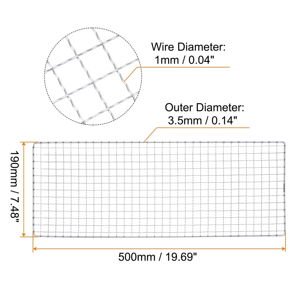 Size - Total Size: 50cm x 19cm / 19.7" x 7.5" (L*W), Wire Diameter: 1mm / 0.04", 3.5mm / 0.14".Material - Made of stainless steel with electroplated and polished surface treatment, has high hardness to hold more food on it.Features - Easy to clean and reuse, a wide range of applications like family gatherings, friends parties, holiday celebrations, outdoor picnics, camping, etc,.Applications - Welded well grill net can keep the food from falling to the charcoal, suitable for barbecue grilling, baking, charcoal grilling, or roasting.Note - Please choose the right size and shape barbecue grill net according to your grills.1. Grill net is used to hold food on the barbecue grill and keep the grease from falling to the charcoal.2. Made of electroplated stainless steel, welded well, has high hardness to hold more things on it.3. Easy to clean and reuse, can use for times at home or outdoor living.4. Suitable for barbecue grilling, baking, charcoal grilling, roasting, family gathering, outdoor picnic, camping, etc,.5. Note: Please choose the right size and shape barbecue grill net according to your grills.