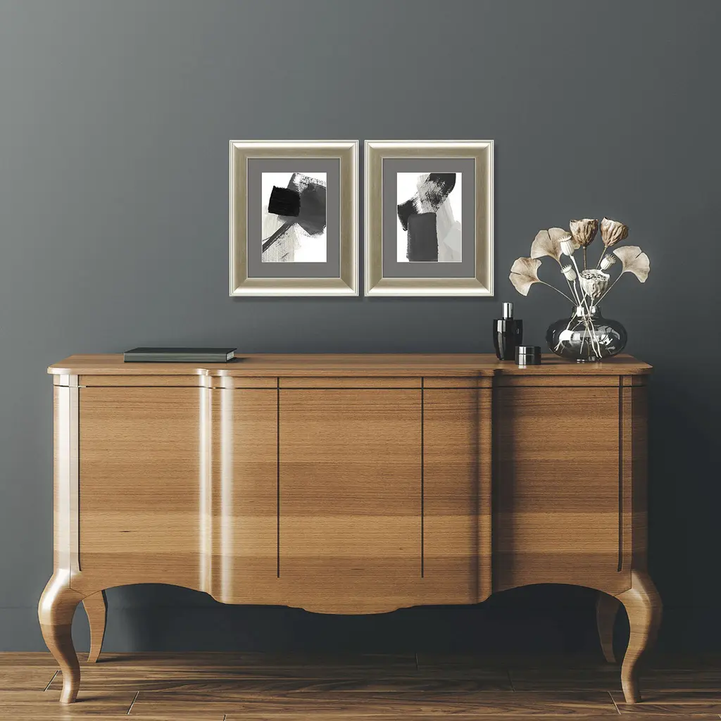 Geometric blocks in gray and black are matted in cinder. Framed in a modern brushed silver finish moulding.