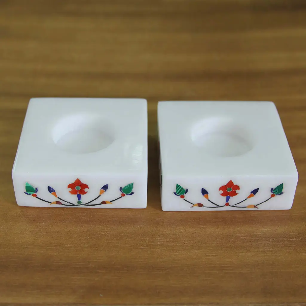Square Marble Tealight Holder With Engraved Vines (Pair)- White Garden