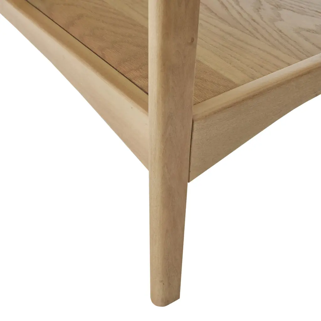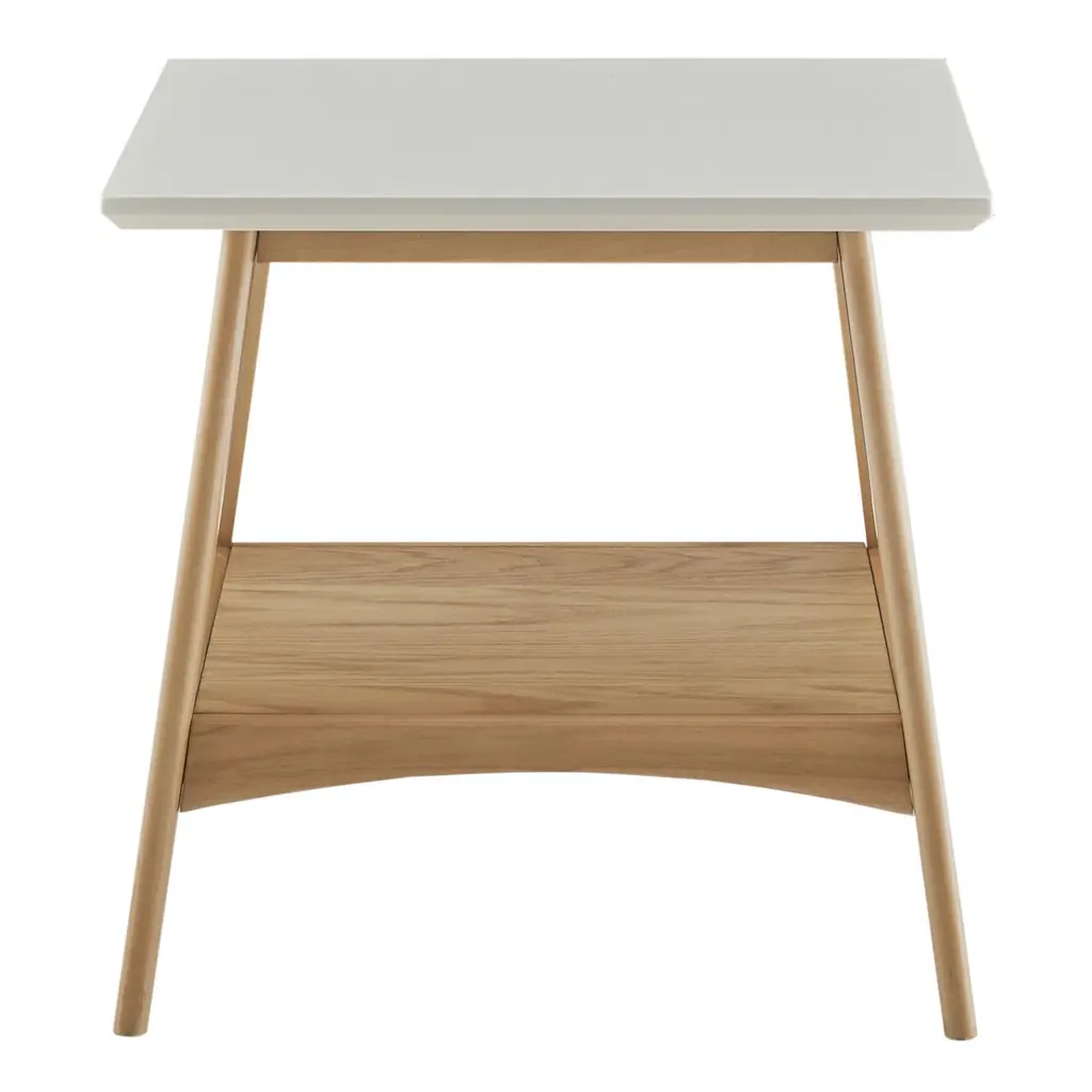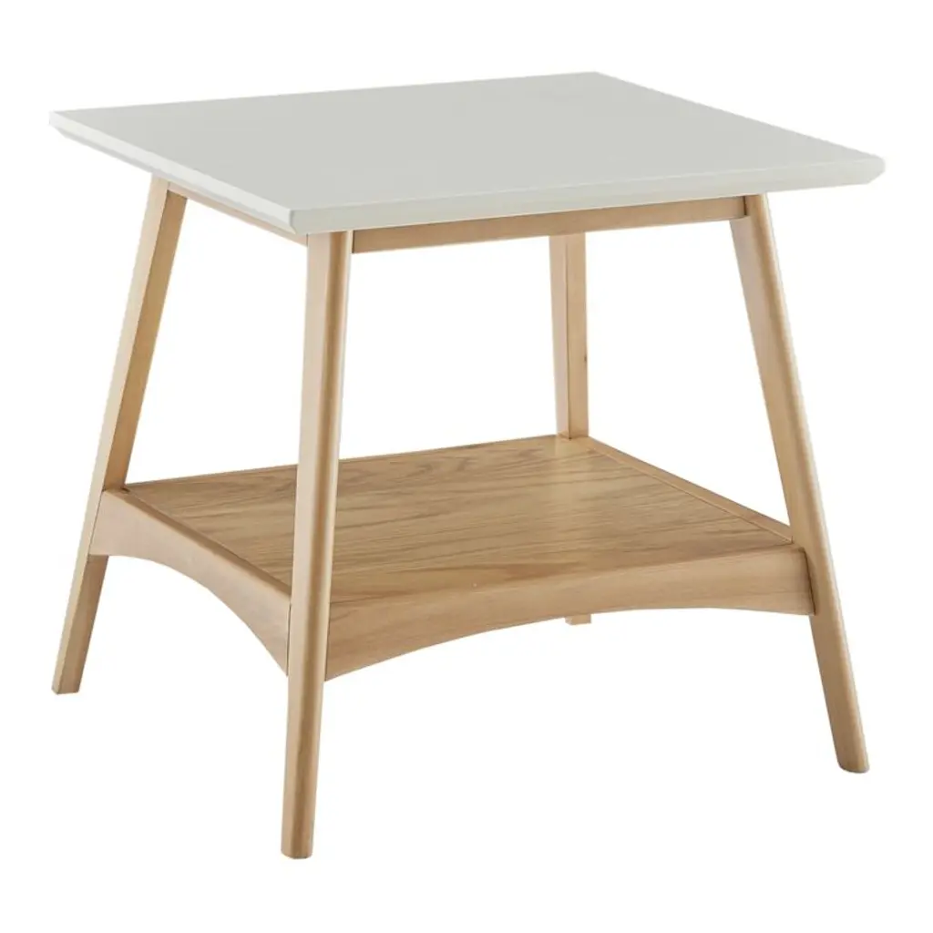 Featuring a warm wood base in your choice of pecan or natural finishes and an off-white square top, this mid-century end table is a bold statement piece. A small-space accent table that refreshes the look of any room, its open shelf, clean lines, angled A-frame legs and two-tone farmhouse hues add a bright new look to your home decor.