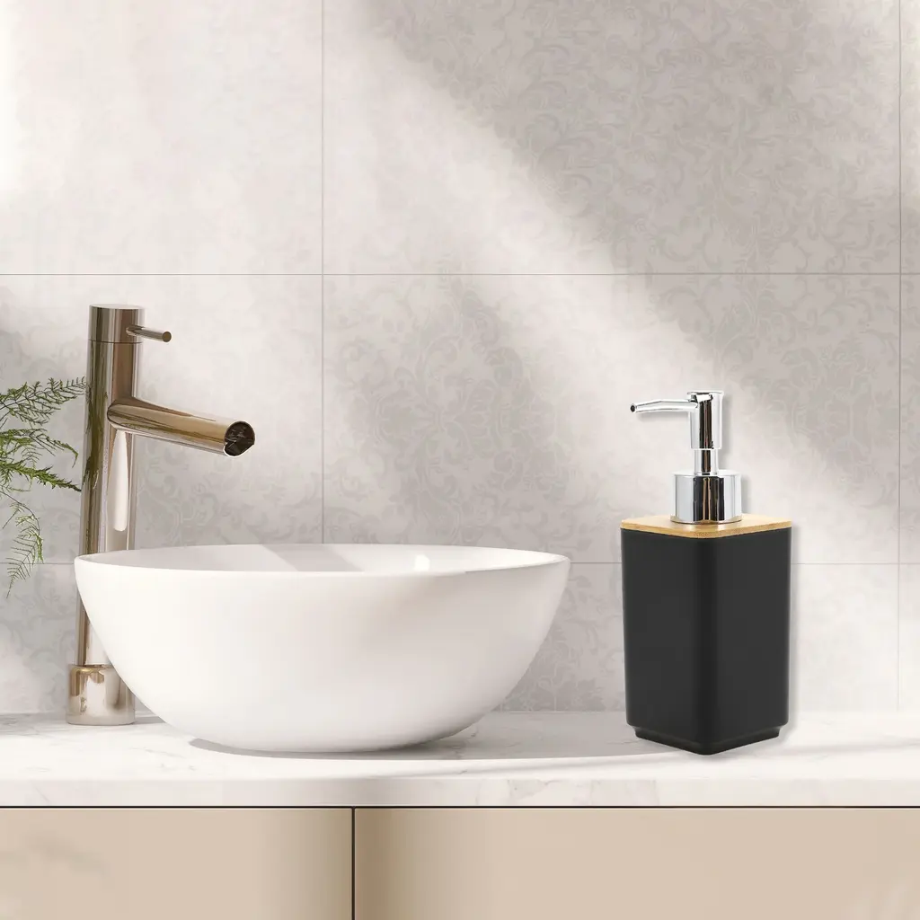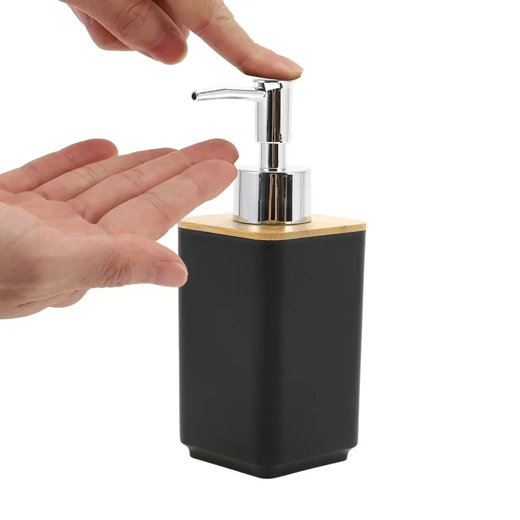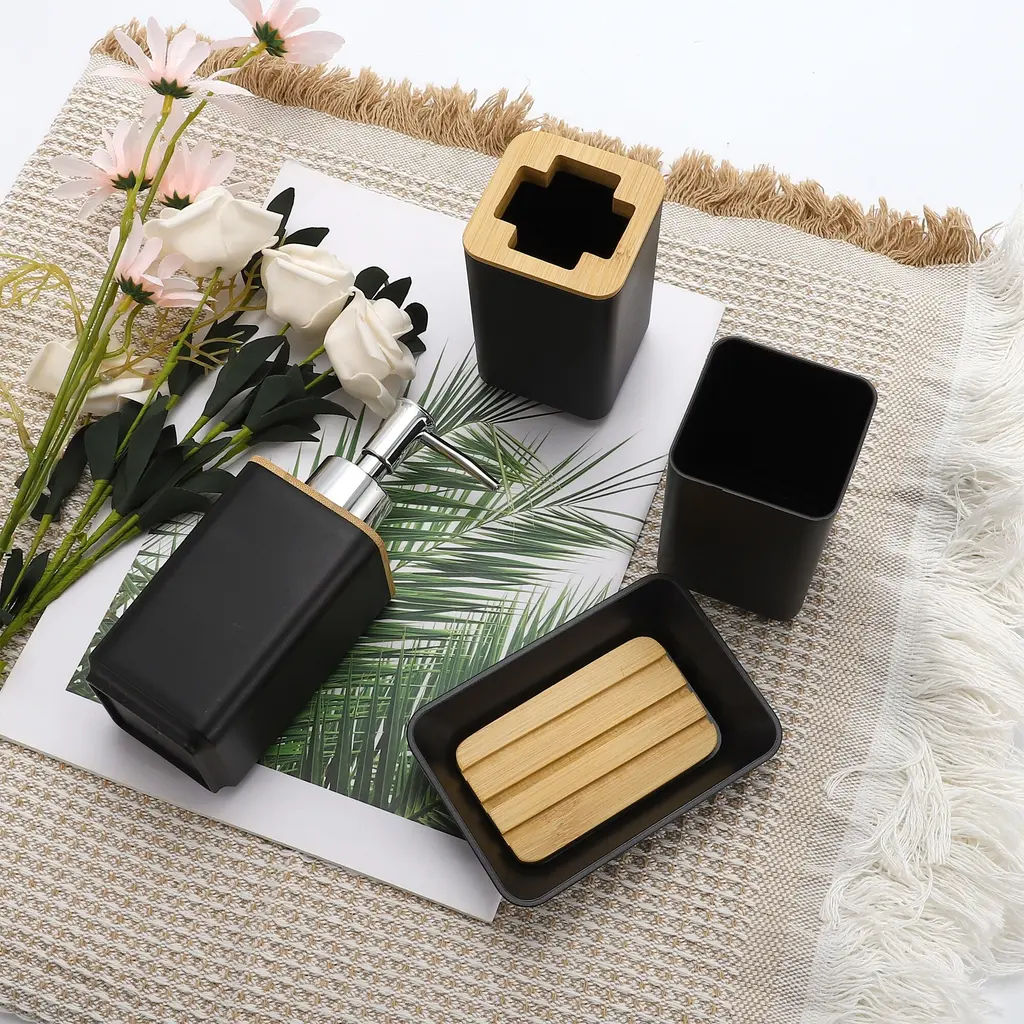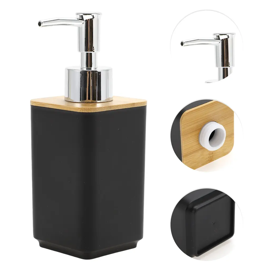 Feature:Liquid soap dispensers set are a more stylish home decor for kitchen and bathroom countertops.Stylish and modern design, simple yet elegant, adding a touch of sophistication to everyday essentials.Easy to pump, falls well on hands when pressed and does not spray on clothes.Specification:Color: BlackMaterial: Plastic, BambooBath Bottle Size: 6.5x6.5x16.8cm / 2.56"x2.56"x6.61"(L*W*H)Toothbrush Holder Size: 6x6x10.5cm / 2.36"x2.36"x4.13"(L*W*H)Mouthwash Cup Size: 6x6x10.2cm / 2.36"x2.36"x4.02"(L*W*H)Soap Box Size: 12.5x8x3cm / 4.92"x3.15"x1.18"(L*W*H)Package Included: 1 Set Soap Pump Dispenser