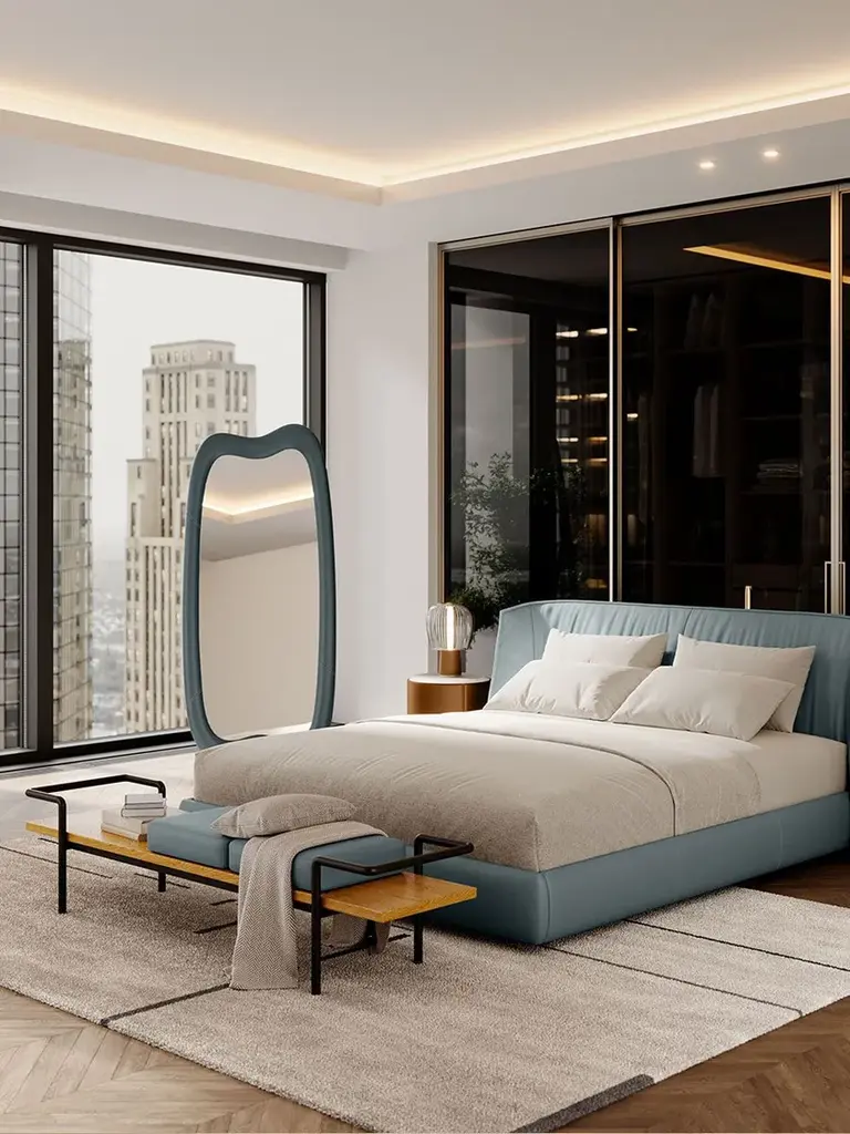 The Squash full-length mirror is upholstered in leather and replicates the curvy and flowing contours of its namesake collection. It is characterized by a contrasting rigid material (glass) and the soft, tactile, rounded frames covered in Pelle Frau ColorSphere® leather. The full-length mirror can be wall-mounted or freestanding on an adjustable tripod, purchased separately. The mirror is available in the colors SC 92 Garnet, SC 67 Chiodi di Garofano and SC 254 Steel Blue.Poltrona Frau and Faye Toogood redefine luxury through their first collaboration, embodied in the Squash collection. A playful and sensual name that reflects the soft and sculptural design approach of the British studio. Squash armchairs offers an idea of easy and modern elegance. The soft lines and plush padding subvert the suffocating rigidity of formal furnishings, making the collection comfortable and inviting at first glance.