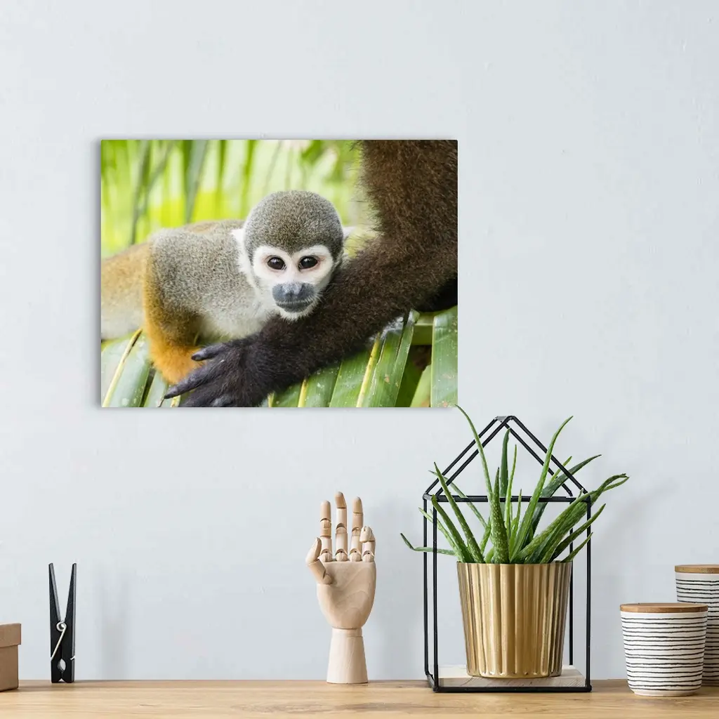 Adult common squirrel monkey (Saimiri sciureus), in San Francisco Village, Amazon Basin, Loreto, Peru, South America