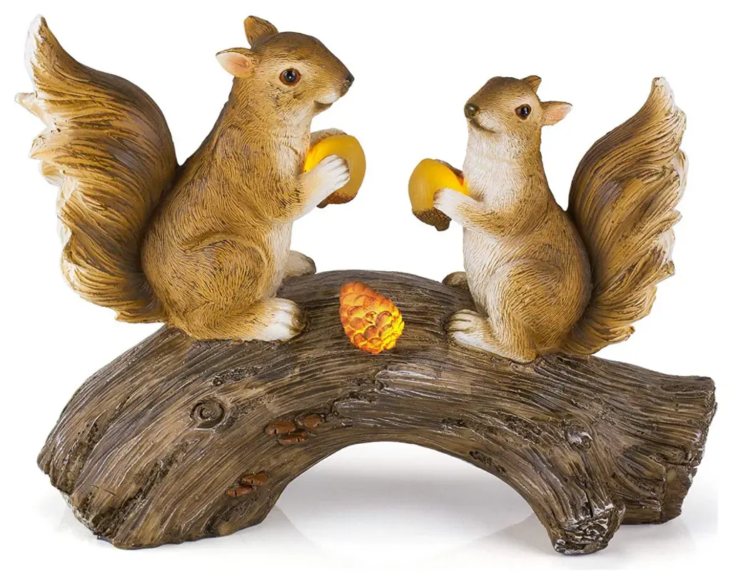 Features:- Squirrels on a Log Solar LED Light - Great addition for your garden!- Perfect for any place with direct sunlight such as Outdoor Patio, Garden, Porch, Lawn, Pathway, or Driveway, etc.- Powered by a solar panel, the solar powered LED garden light absorbs energy in the morning and switches on as the sun goes down. The solar powered light will shine for hours when fully charged.- Measures: 9"W x 7"H- Poly resin Construction and Rechargeable battery included