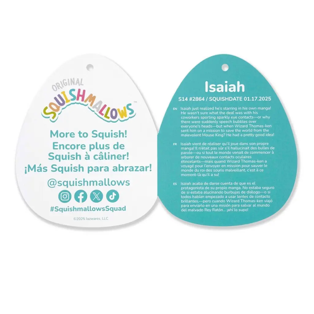 Isaiah just realized he’s starring in his own manga! He wasn’t sure what the deal was with his coworkers sporting sparkly eye contacts—or why there were suddenly speech bubbles over everyone's heads—but when Wizard Thomas-ken sent him on a mission to save the world from the malevolent Mouse King? He had a pretty good idea!Meet your new bestie, Isaiah! Each Squishmallow plush comes with its own unique name and bio and makes the perfect cuddly companion for long flights out or comfy nights in. Isaiah is only by Original Squishmallows. Join the Squad today!14in Squishmallows Isaiah Turquoise Yak Plush3+
